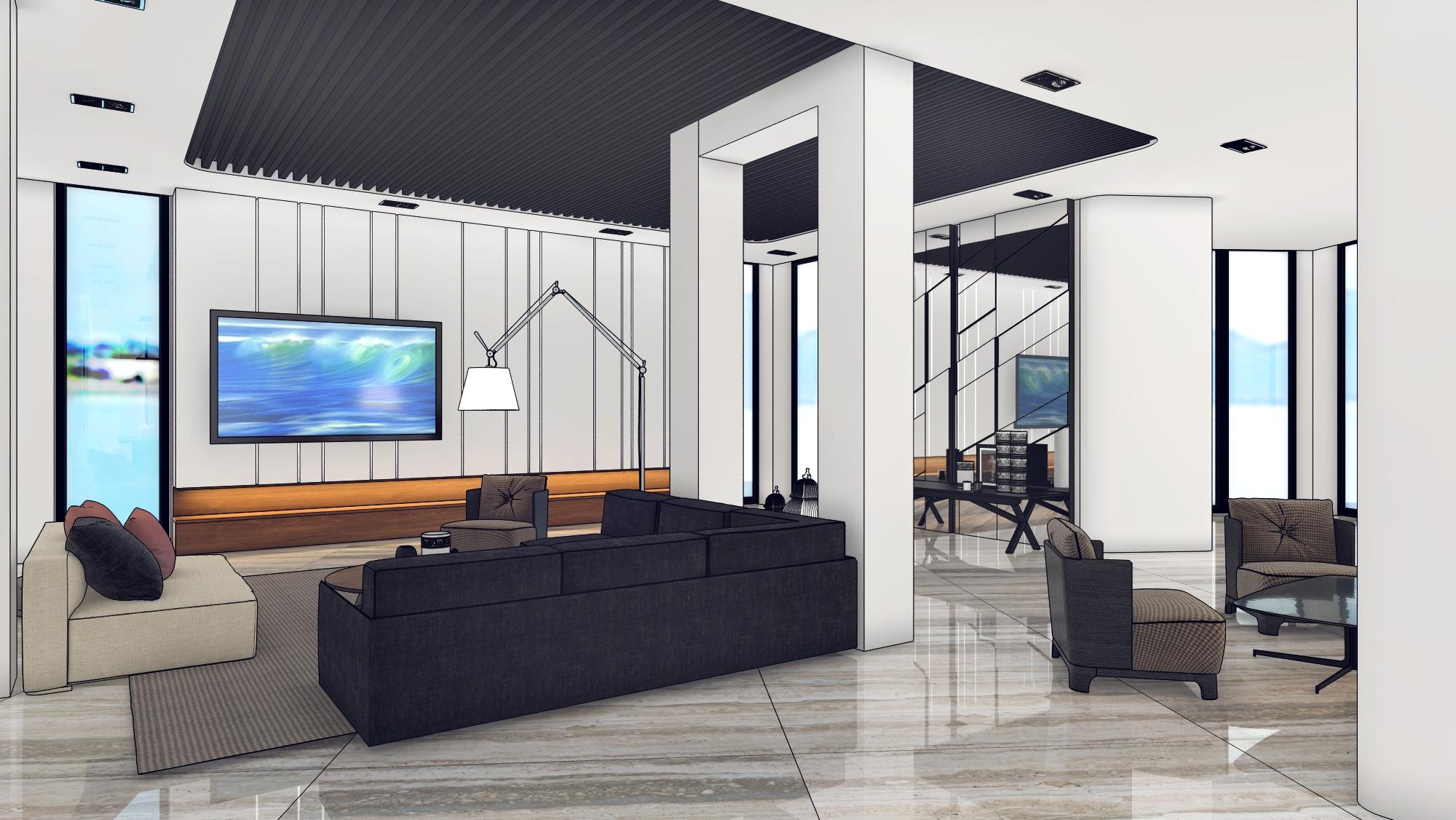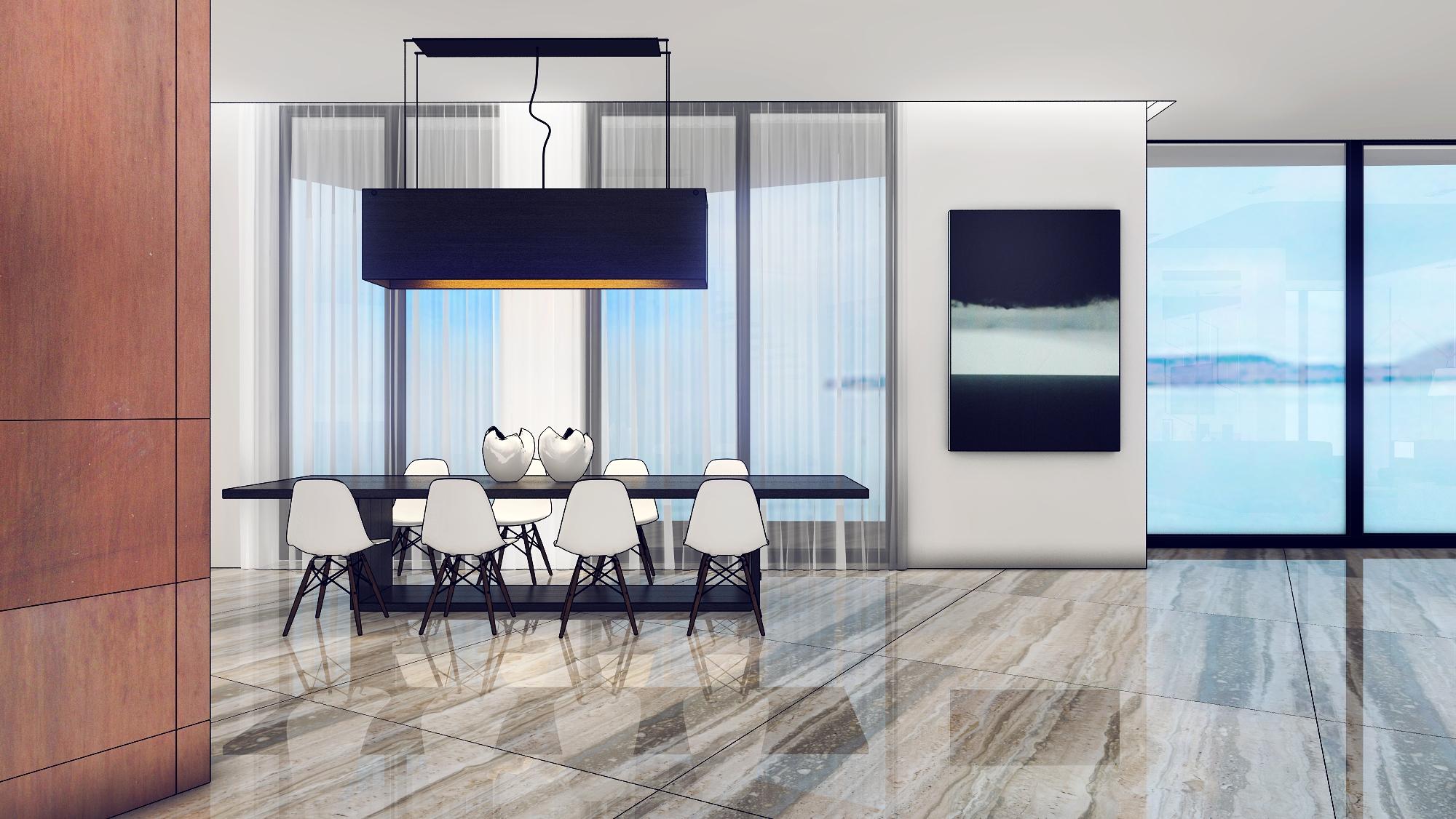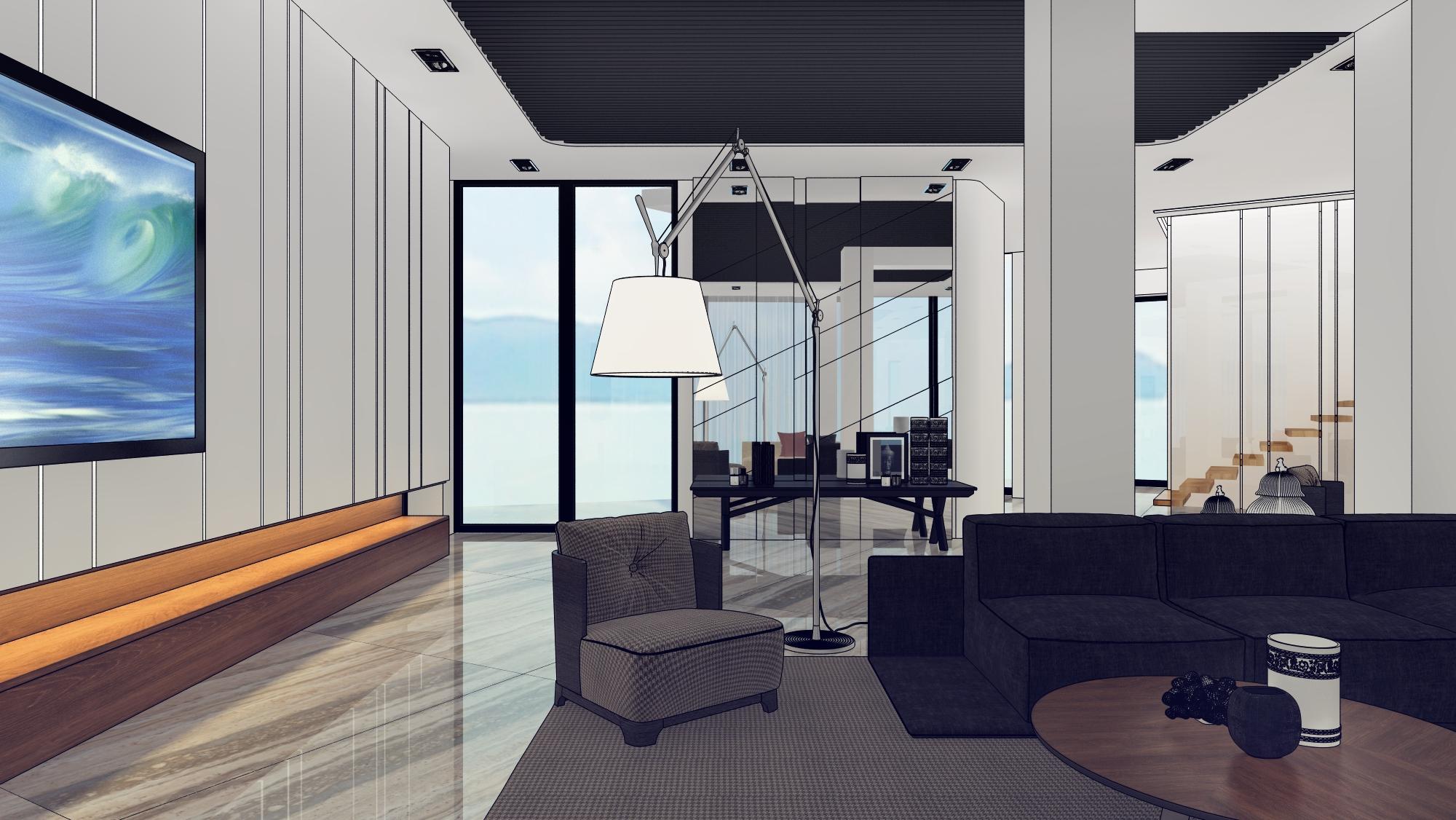 За счет панорамного остекления и минимума перегородок между функциональными зонами пространство насыщено естественным светом, дом свободно дышит. Дизайн интерьера акварелью передает ощущение свежести и энергии, которые хотелось воплотить в оформлении. Зрительную динамику вносят контрастные цвета: белый, темно-коричневый, темно-серый. Серые мраморные плиты в качестве единого напольного покрытия подчеркивают идею перетекающих объемов.