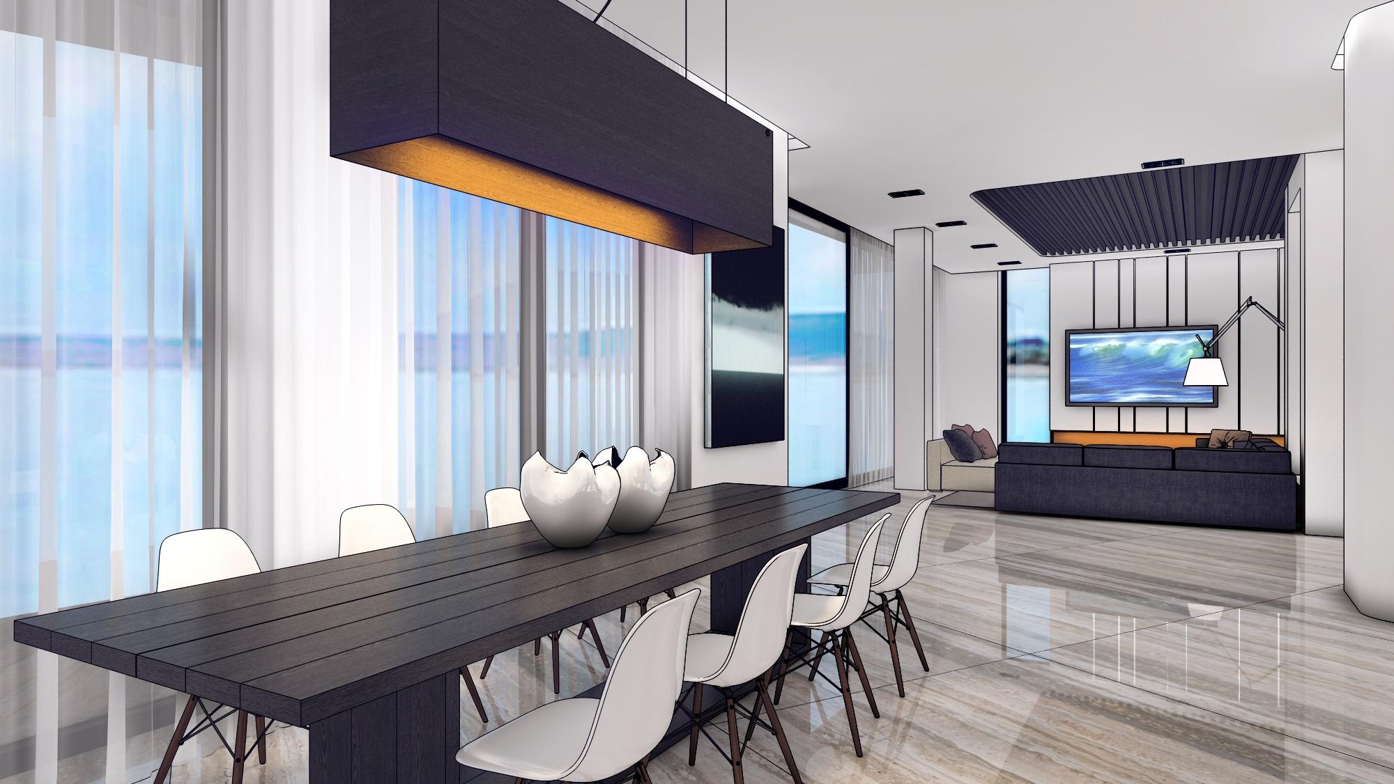 Большое светлое пространство общественной части в эскизных интерьерах дома открыто солнечным лучам, благодаря расположению зон вдоль панорамного остекления. Холл, гостиная и столовая с кухней свободно переходят друг в друга, образуя удобную в использовании жилую среду. Современный стиль с его лаконичными красками и природными материалами наделил обстановку комфортом.