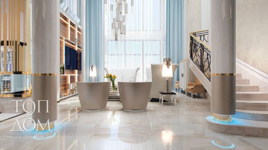 Решение разместить лестницу на второй этаж в гостиной часто связано с недостаточной площадью холла, но не всегда. В проекте коттеджа с уникальными интерьерами в современном стиле такая планировка выгодно преобразила помещение. Дизайн мраморной лестницы – с золотистыми перилами и голубой подсветкой колонны – удачно вписан в парадную обстановку.