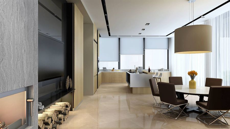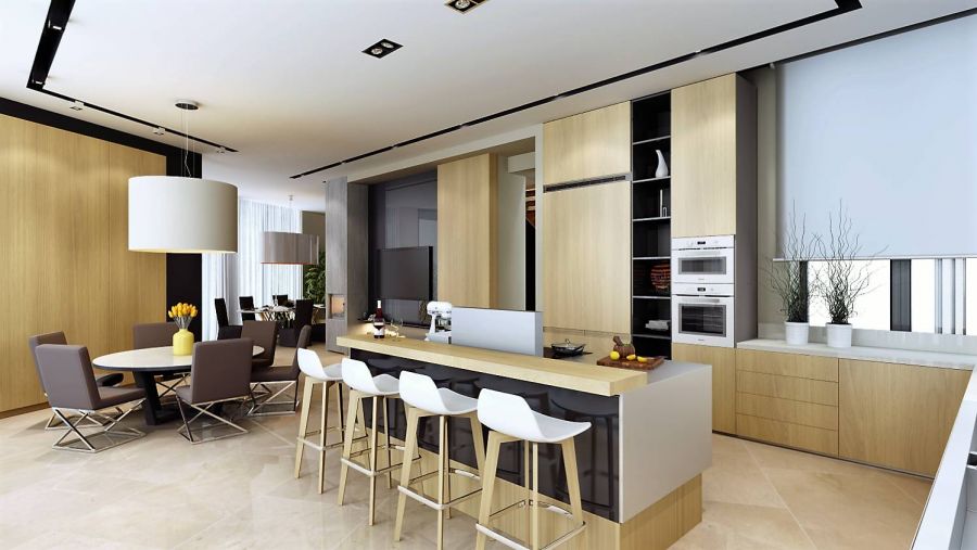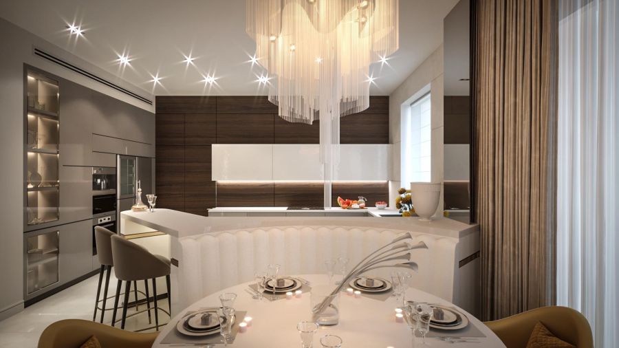 Нейтральный светло-бежевый оттенок напольной плитки и оштукатуренных стен создает традиционно гармоничный фон для нарядной белой мебели и темно-коричневых деревянных панелей в зоне готовки. Нотку роскоши в современный сдержанный декор вносят золотые акценты – фигурная люстра над обеденным столом, полукруглые стулья, блестящий кант на барной стойке, шторы цвета темного золота.