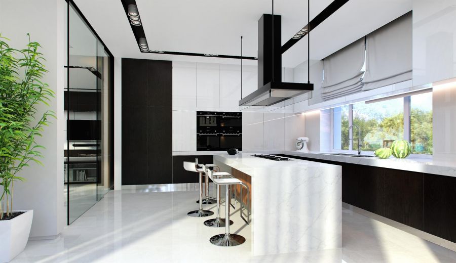 В проекте белого интерьера дома кухонное пространство оформлено в актуальной черно-белой гамме. Динамичный цветовой контраст дополняет сочетание матовых деревянных панелей и глянцевых фасадов. Их сияние усиливают хромированные барные стулья и металлические потолочные светильники, а смягчают урбанистичный образ вставки светло-коричневого дерева на «острове».