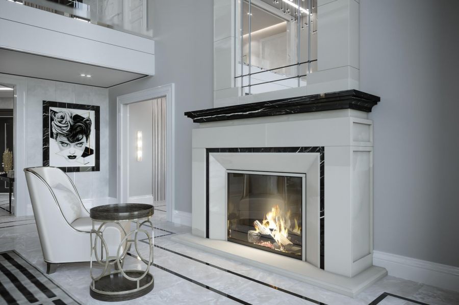 Современное оформление интерьеров комнат загородного дома включает красивую отделку каминной зоны в двусветной гостиной. Белая каменная облицовка в сочетании с контрастными черными вставками не нуждается в дополнительных цветовых акцентах. Роль декора здесь играет высокое настенное зеркало, выполненное на высоту двух этажей.