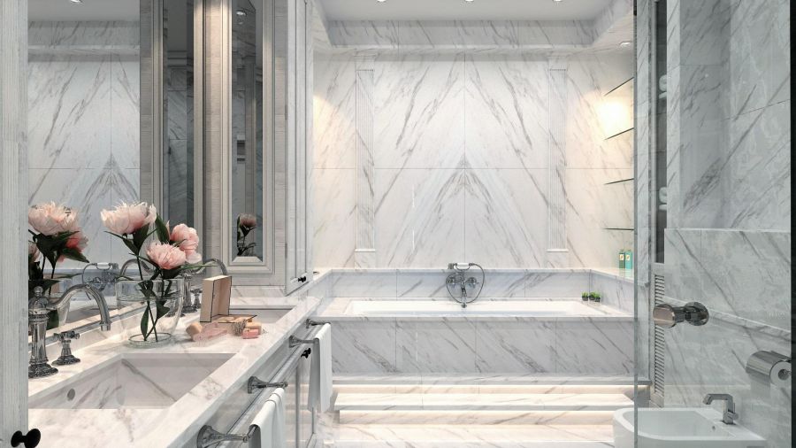 Спроектированы две зоны умывания, что сэкономит время на утренний туалет для супружеской пары или большой семьи. Площадь санузла позволяет установить вместительную ванну на подиуме с подсветкой, подвесные модели унитаза и биде, застекленную душевую кабину. Зона купели выделена декоративными настенными пилястрами.