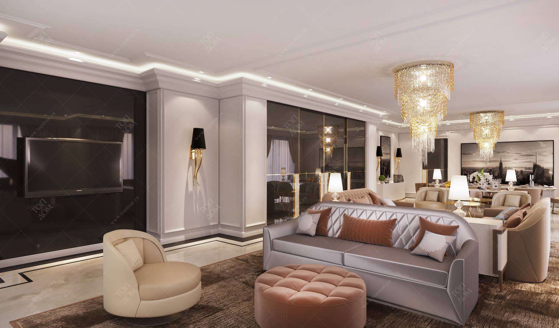 Больше примеров красивых интерьеров комнат в домах и квартирах вы найдете в фотогалерее проектов «ТопДом». В портфолио представлено свыше 4 000 реалистичных изображений дизайна помещений, разработанного в современных и классических стилях.
