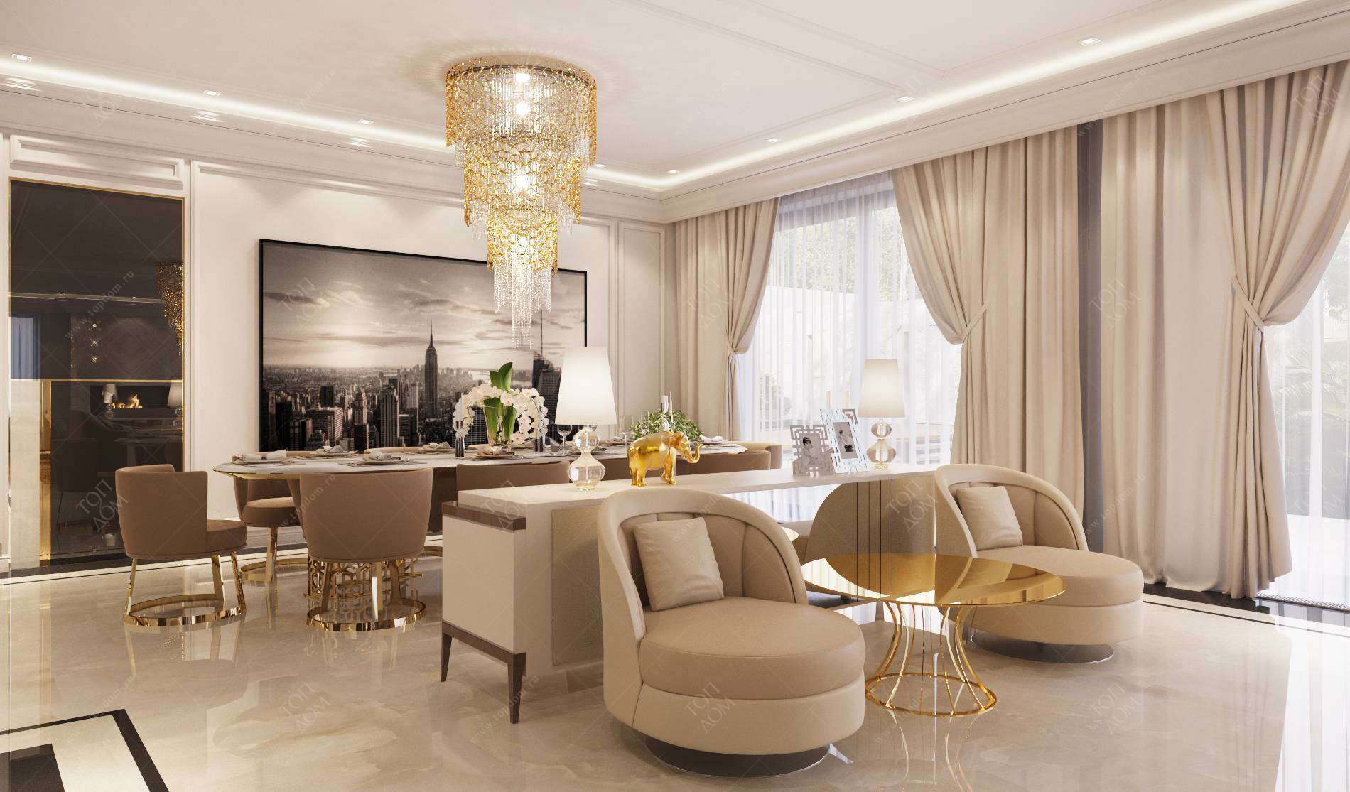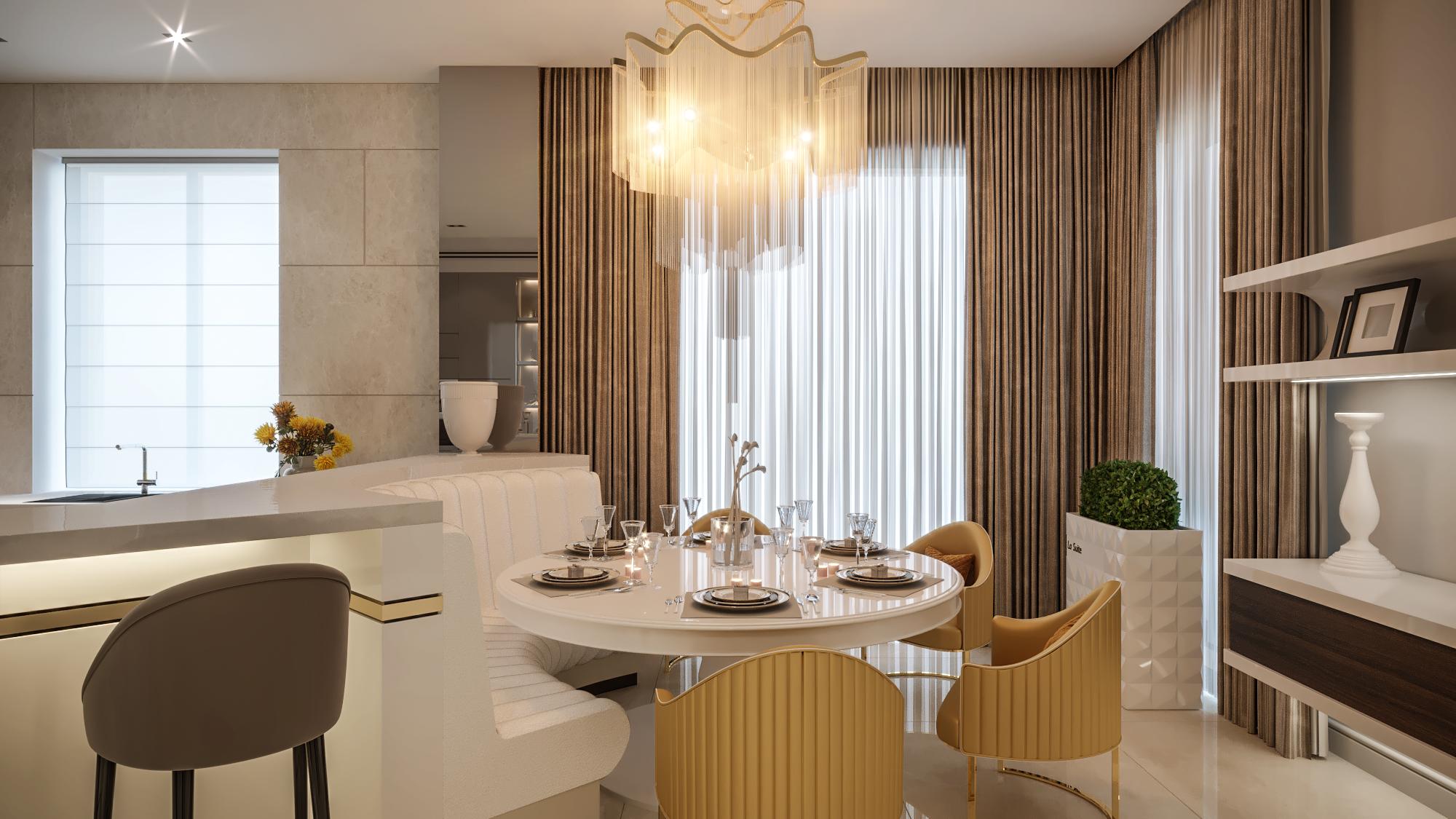 Нейтральный светло-бежевый оттенок напольной плитки и оштукатуренных стен создает традиционно гармоничный фон для нарядной белой мебели и темно-коричневых деревянных панелей в зоне готовки. Нотку роскоши в современный сдержанный декор вносят золотые акценты – фигурная люстра над обеденным столом, полукруглые стулья, блестящий кант на барной стойке, шторы цвета темного золота.