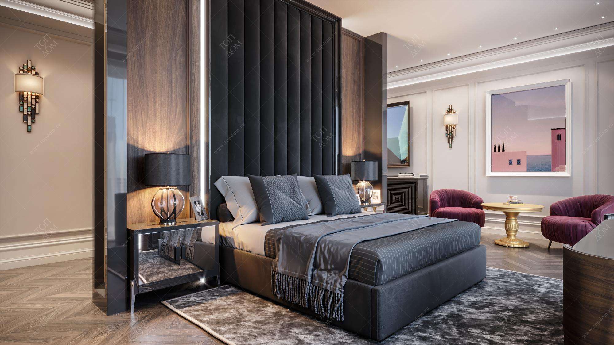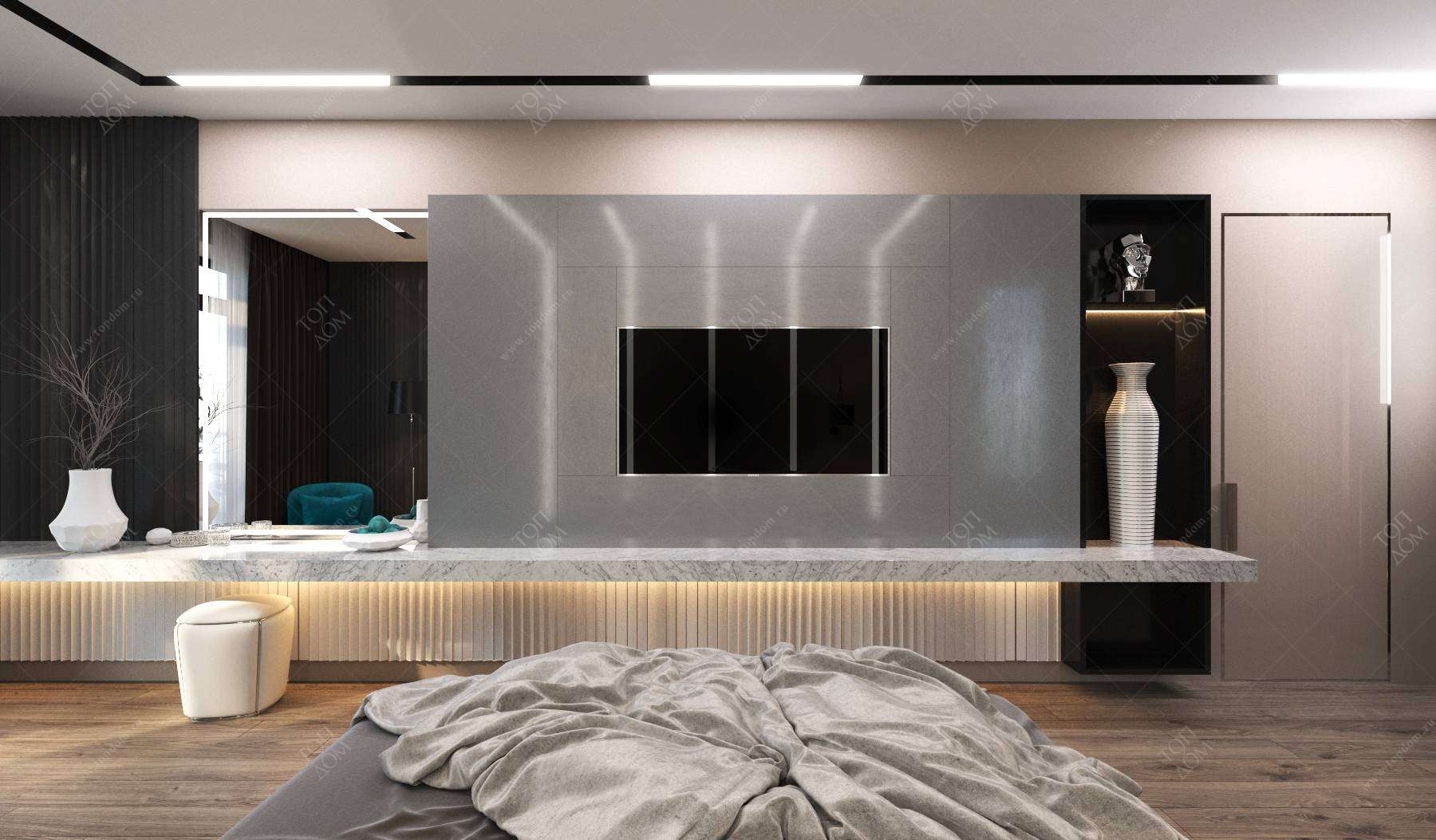 Графичную отделку получила спальня из проекта современного дизайна таунхауса. Светло-серый фон пола и стен хорошо подходит для помещения, где люди отдыхают и набираются сил. Основную палитру эффектно разбавляют белый цвет (настольные лампы, ковер, кресло) и темный стальной глянец прикроватных тумбочек и туалетного столика. Модное акцентное дополнение – рельефная панель за кроватью.