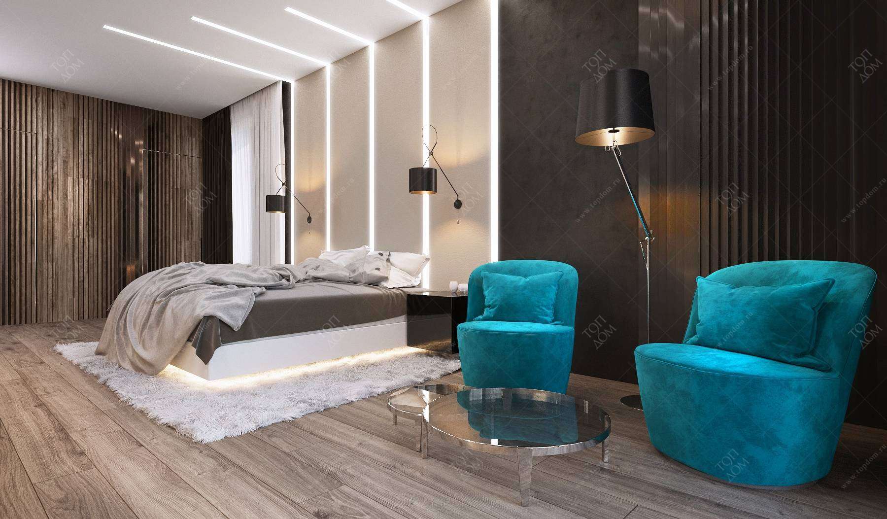 Для проекта эко-дизайна интерьеров загородного дома разработана спальня в серо-коричневой гамме. Идея превратить мраморную полку под телевизором в туалетный столик позволяет рационально использовать пространство ТВ-зоны. Оригинальные текстурные акценты – стальная панель вокруг плазмы, деревянный планкен на стене, бирюзовые кресла. Чтобы зрительно увеличить размеры компактной комнаты, использована нижняя подсветка короба кровати и подвесные модели тумбочек.