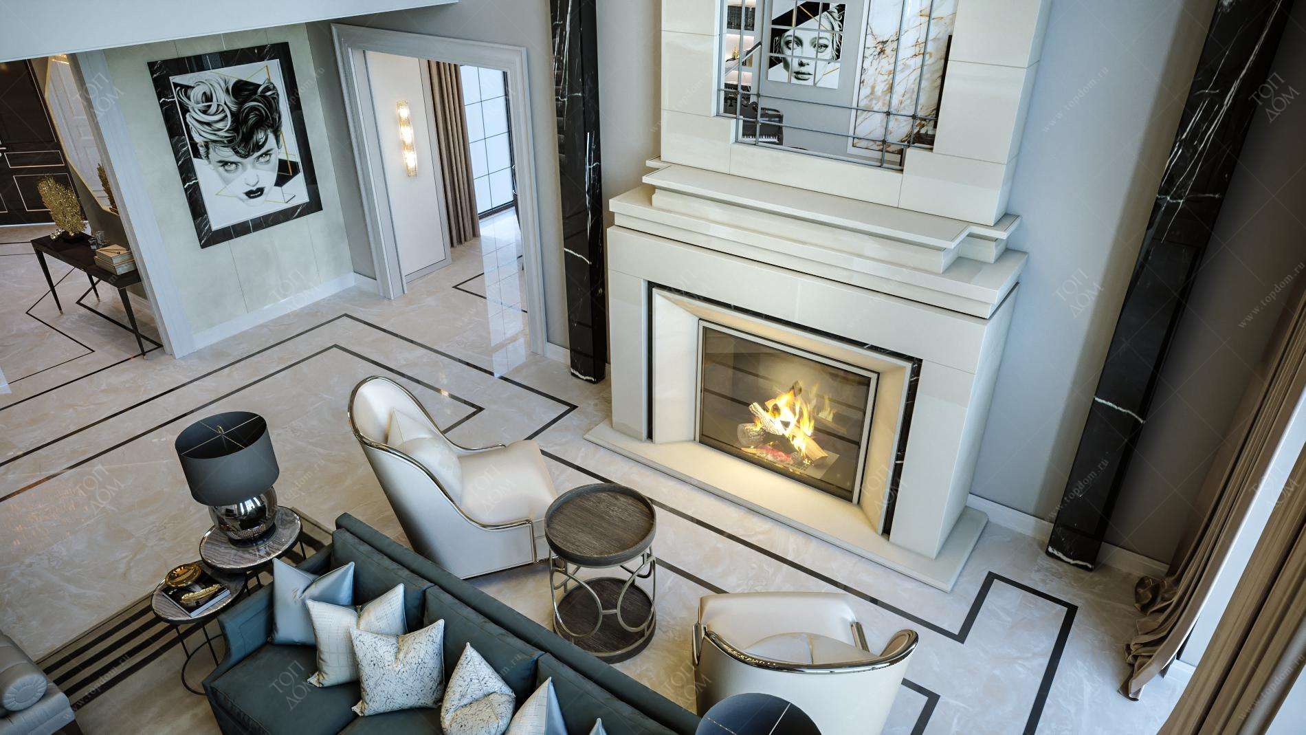 Современное оформление интерьеров комнат загородного дома включает красивую отделку каминной зоны в двусветной гостиной. Белая каменная облицовка в сочетании с контрастными черными вставками не нуждается в дополнительных цветовых акцентах. Роль декора здесь играет высокое настенное зеркало, выполненное на высоту двух этажей.