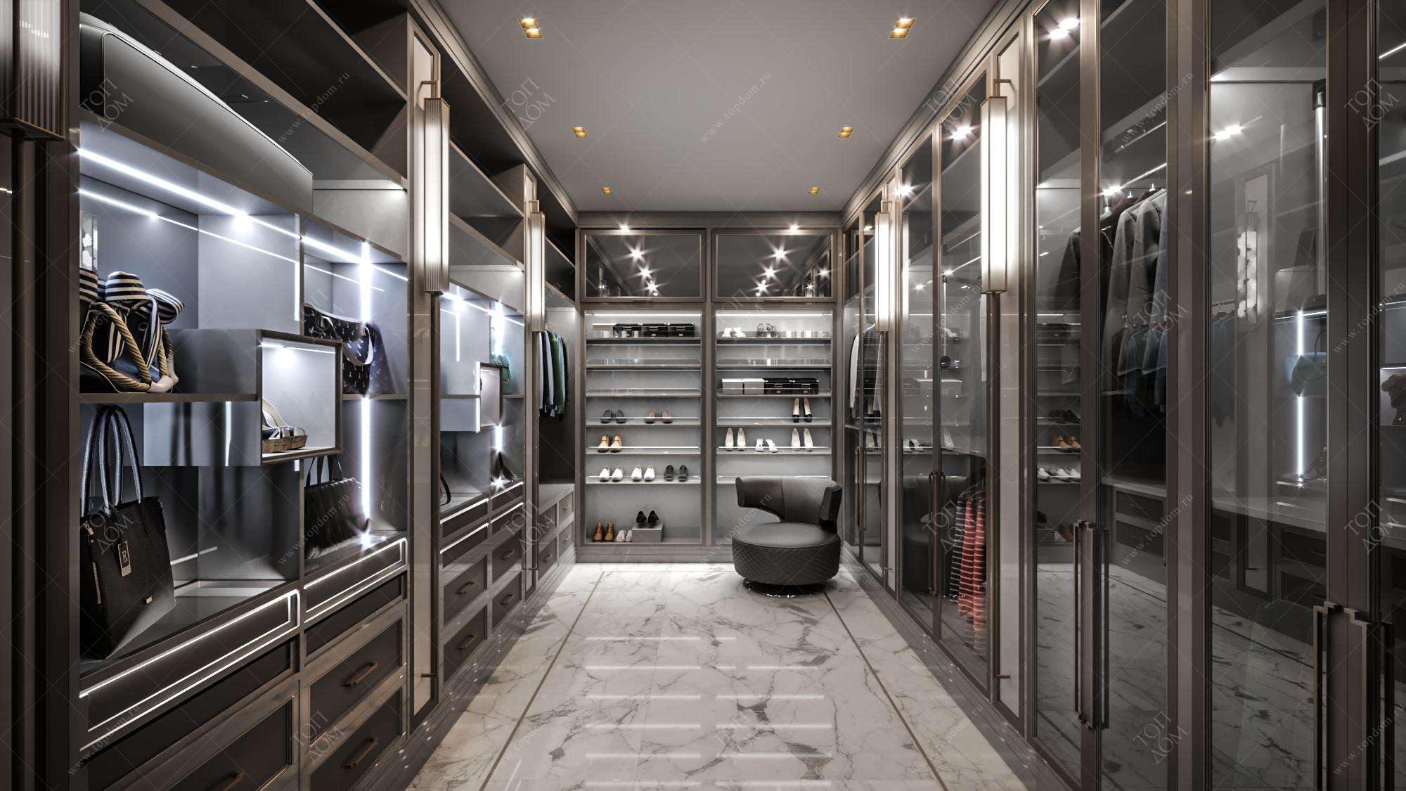В оформление гардеробной комнаты использовано сочетание темно-коричневых шкафов с белым мраморным полом – за счет контраста помещение смотрится более нарядно и вместе с тем сохраняет практичность. Из-за того, что гардероб лишен окон, искусственное освещение здесь предельно функциональное и многоплановое. Задача решается комплексно: