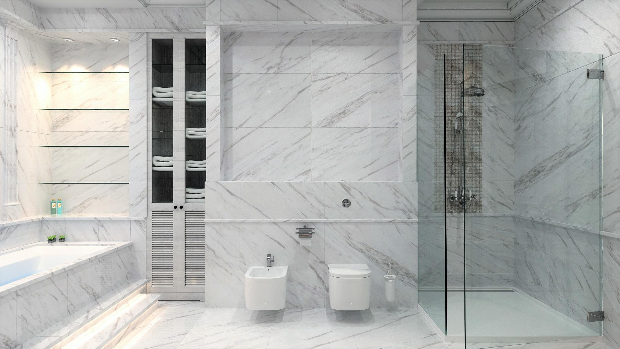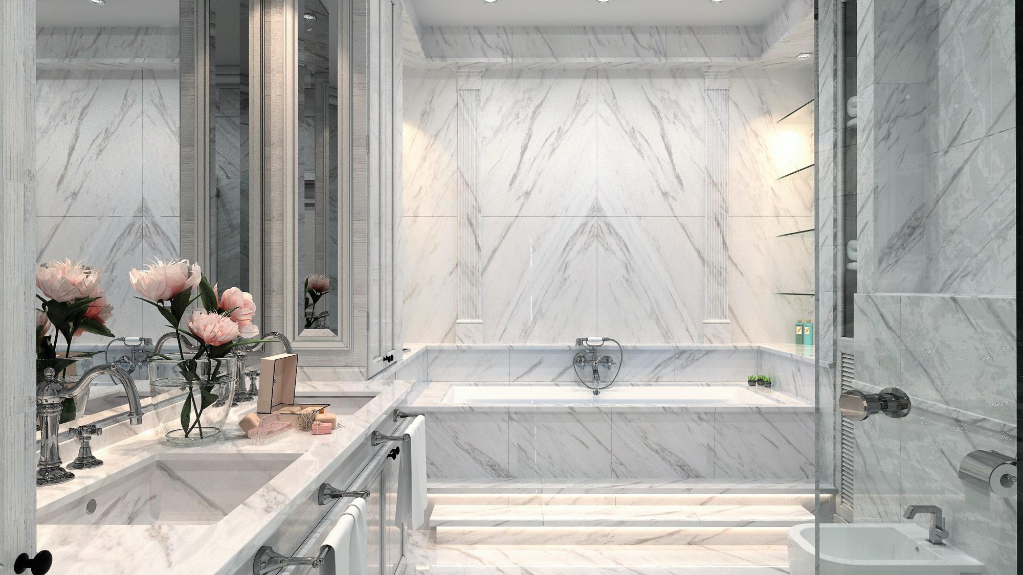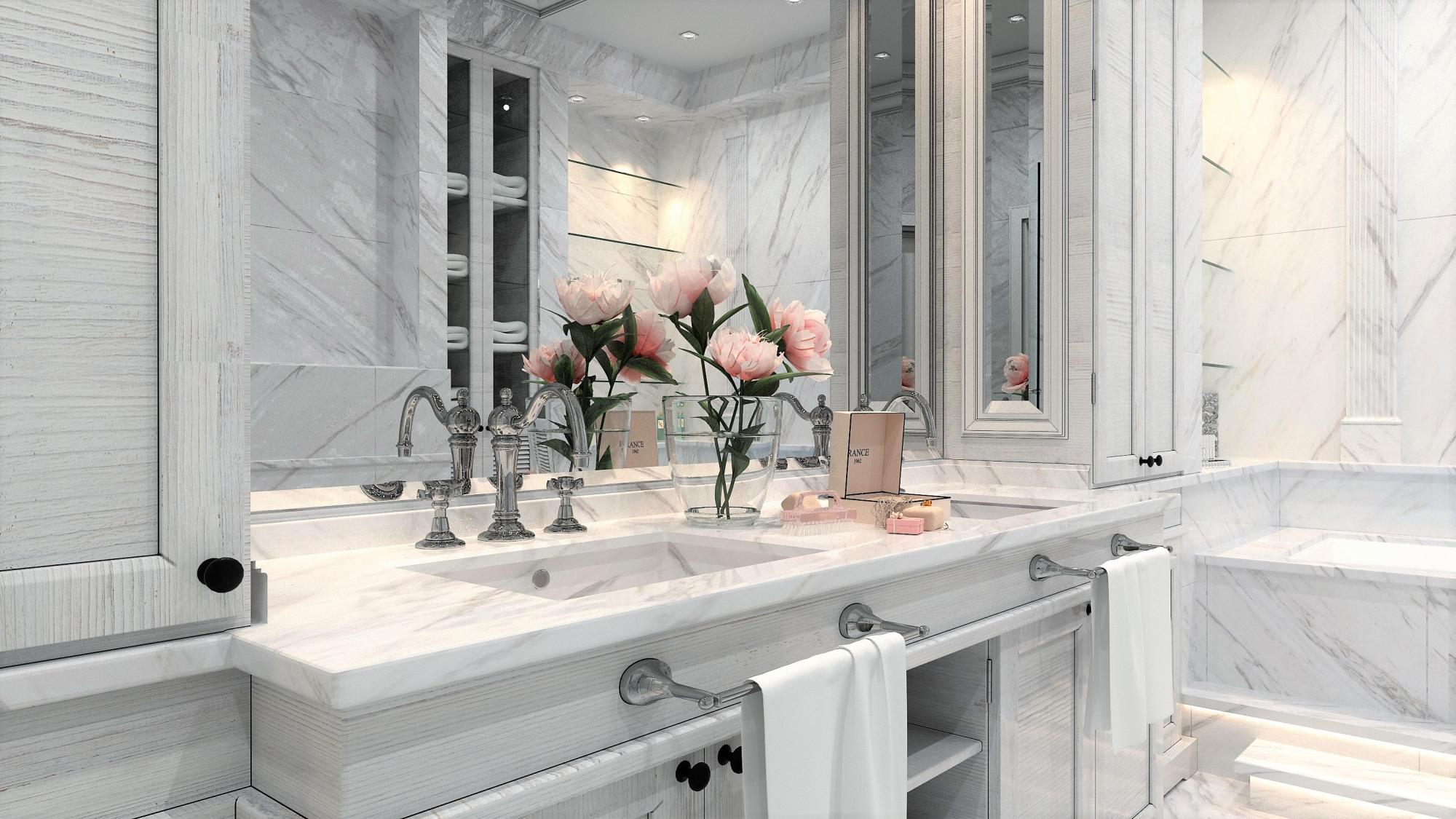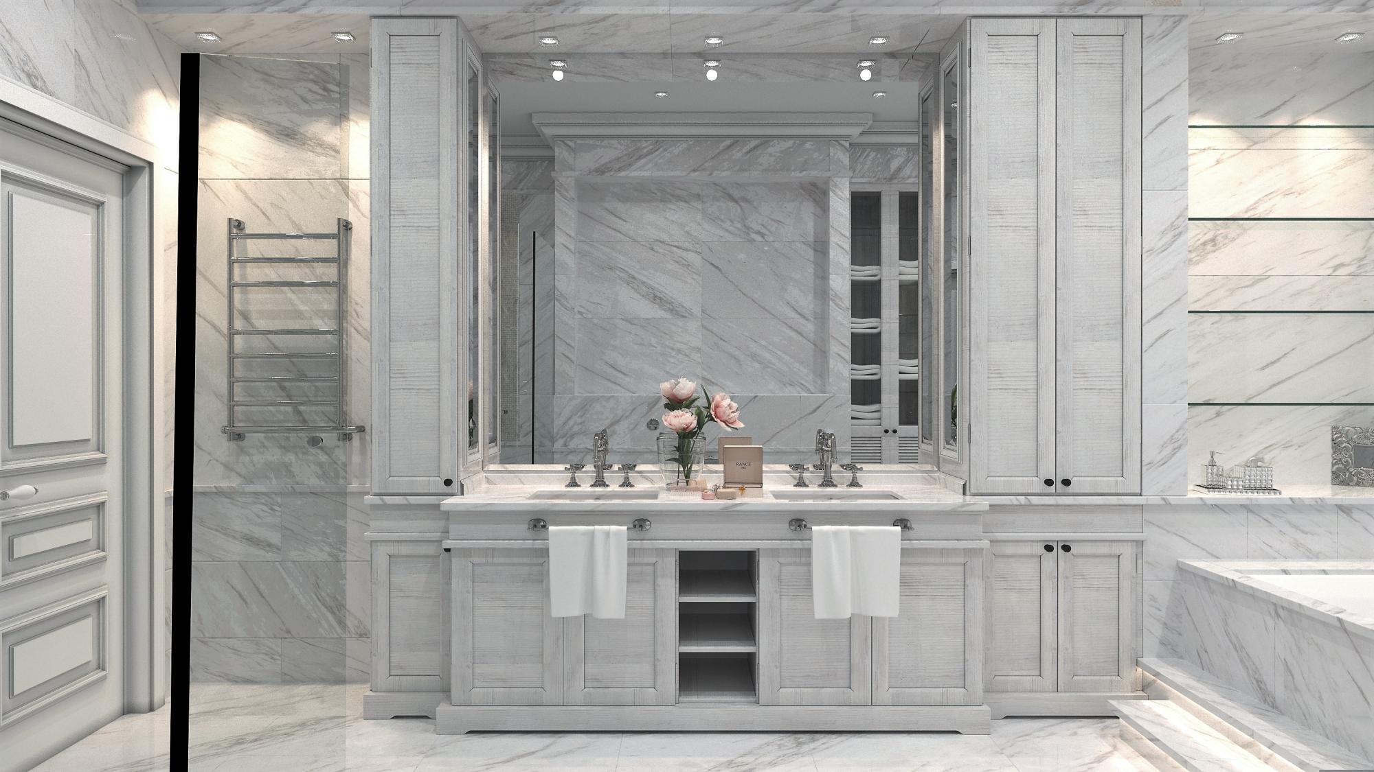 Спроектированы две зоны умывания, что сэкономит время на утренний туалет для супружеской пары или большой семьи. Площадь санузла позволяет установить вместительную ванну на подиуме с подсветкой, подвесные модели унитаза и биде, застекленную душевую кабину. Зона купели выделена декоративными настенными пилястрами.