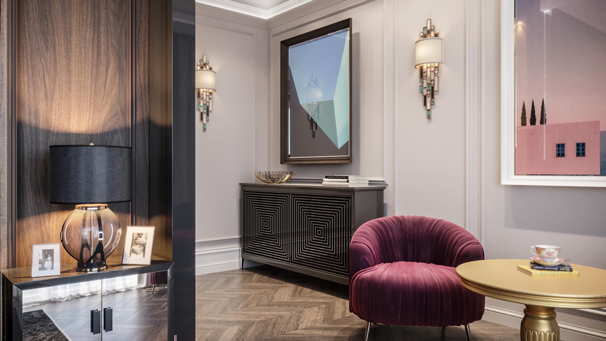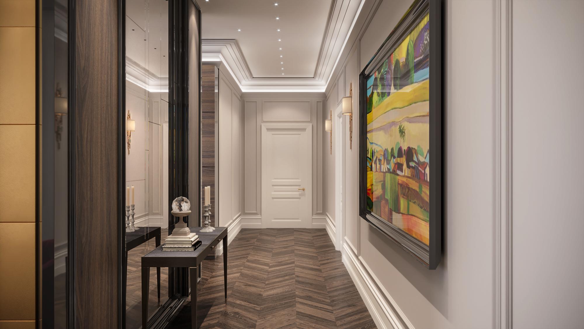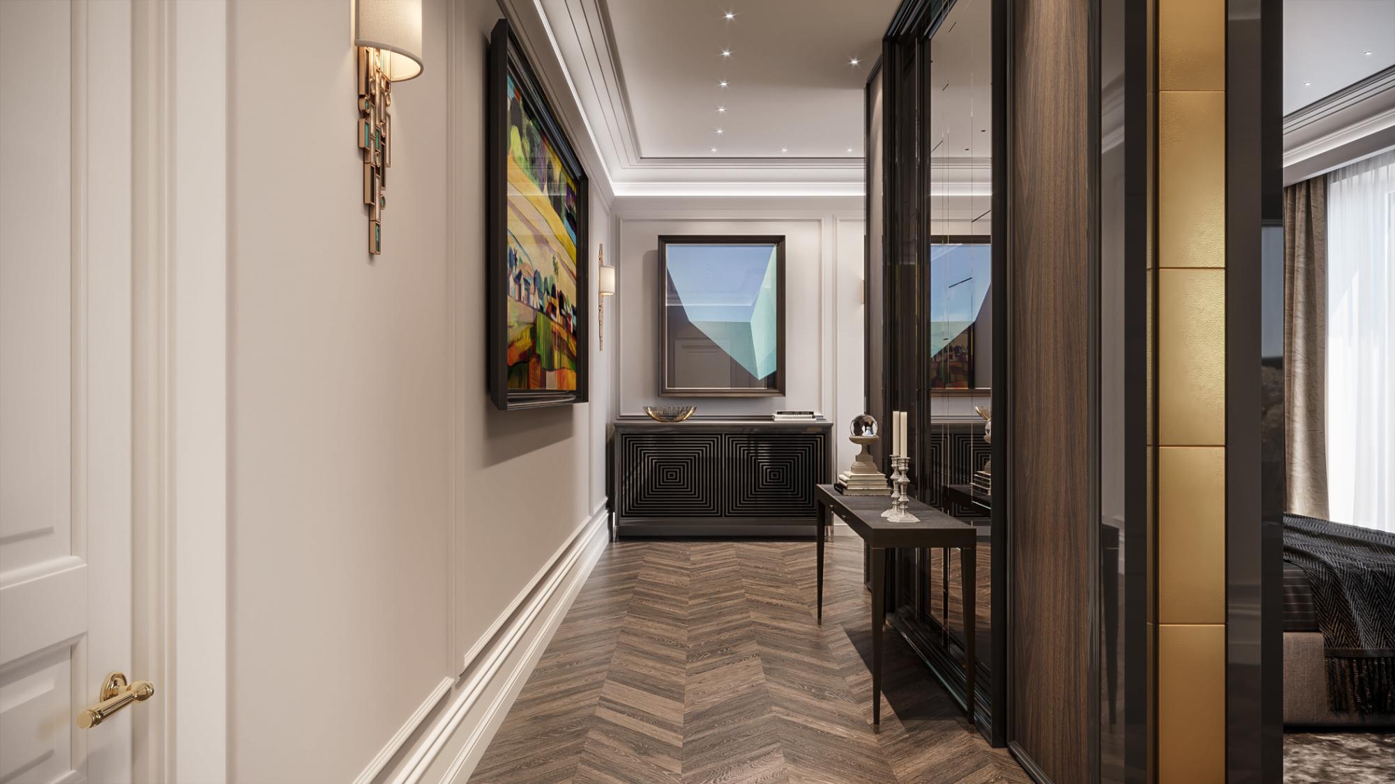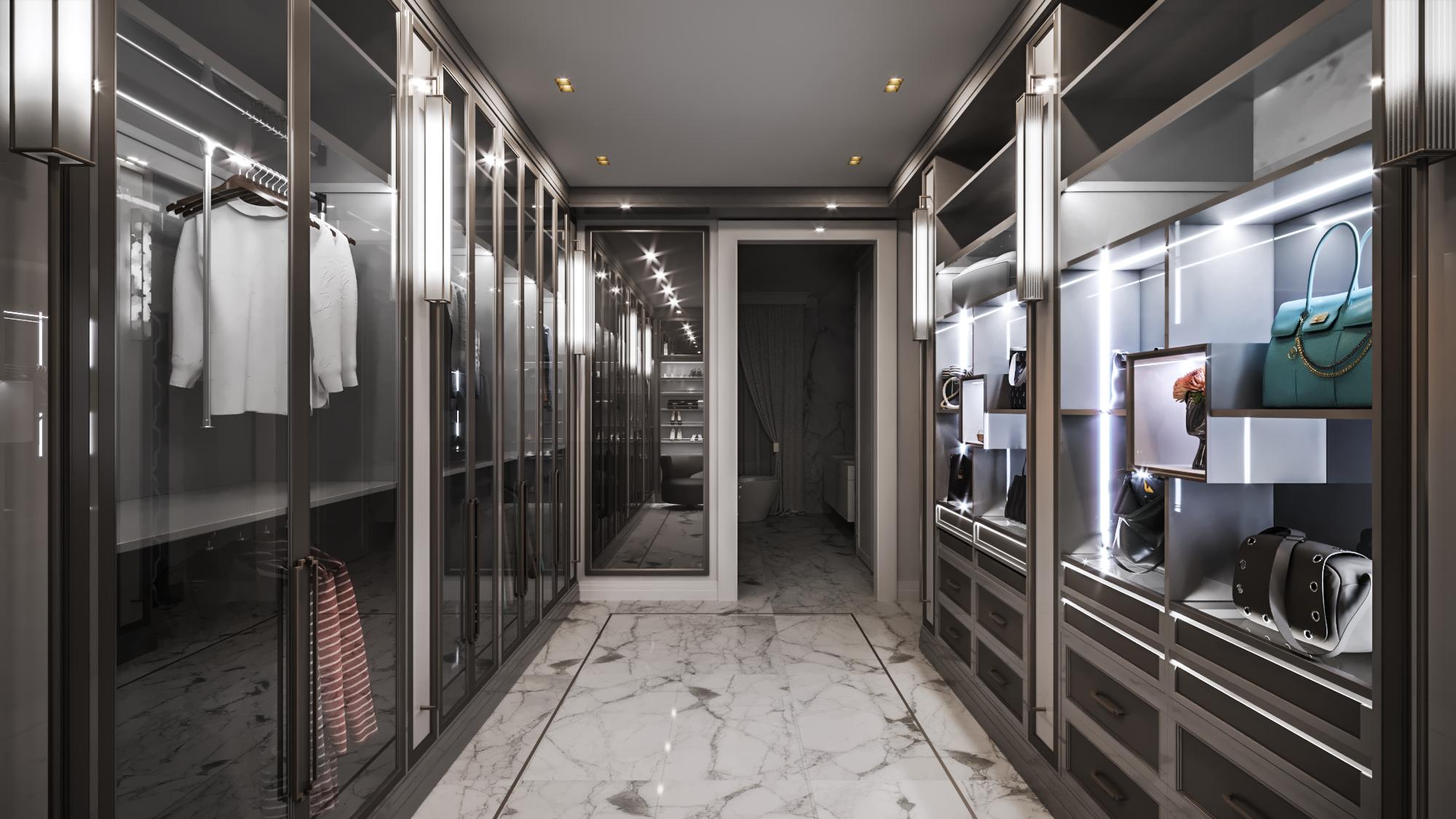 Спроектированы две зоны умывания, что сэкономит время на утренний туалет для супружеской пары или большой семьи. Площадь санузла позволяет установить вместительную ванну на подиуме с подсветкой, подвесные модели унитаза и биде, застекленную душевую кабину. Зона купели выделена декоративными настенными пилястрами.