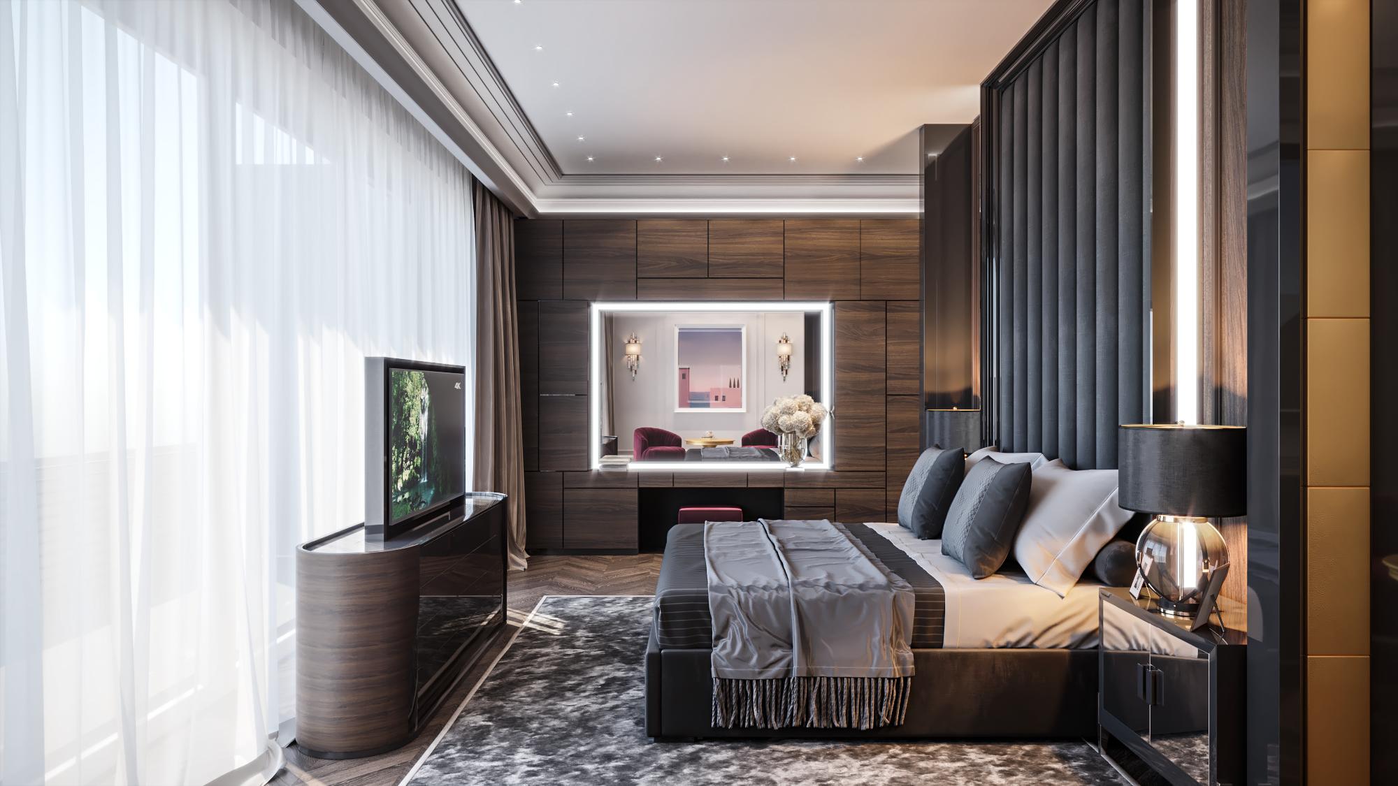 При обилии темных красок помещение не кажется сумрачным. Зеркальные фасады ТВ-комода и прикроватных тумбочек, большое прямоугольное зеркало в нише туалетного столика отражают светлые стены и солнечные лучи. Плюс яркие акценты добавляет встроенная подсветка настенного зеркала и изголовья кровати.