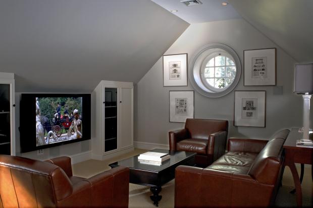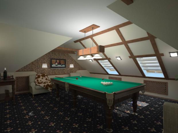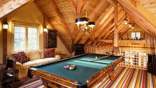 Дизайнеры воплотили мечту любителей провести время с интересом и в спокойной обстановке после рабочего дня или по выходным. Помещение оформлено в доме с плоской крышей, поэтому такое решение можно назвать нетрадиционной мансардой или неполноценным этажом.