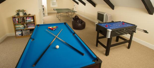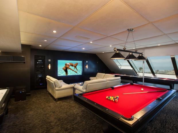 Помещение включает в себя бильярдный стол, домашний кинотеатр, барную стойку и комфортную диванную зону. Обстановка уже сама по себе располагает к отдыху.