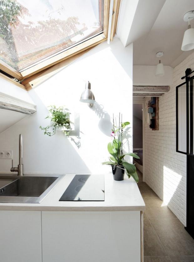 Такое решение выгодно еще и потому, что не в каждой мансарде есть достаточное количество окон для хорошего освещения, а белый цвет сделает помещение не только светлей, но и просторней. Пол можно сделать темным. Красивым акцентом будут потолочные деревянные балки на внутренних сторонах ската под цвет пола.