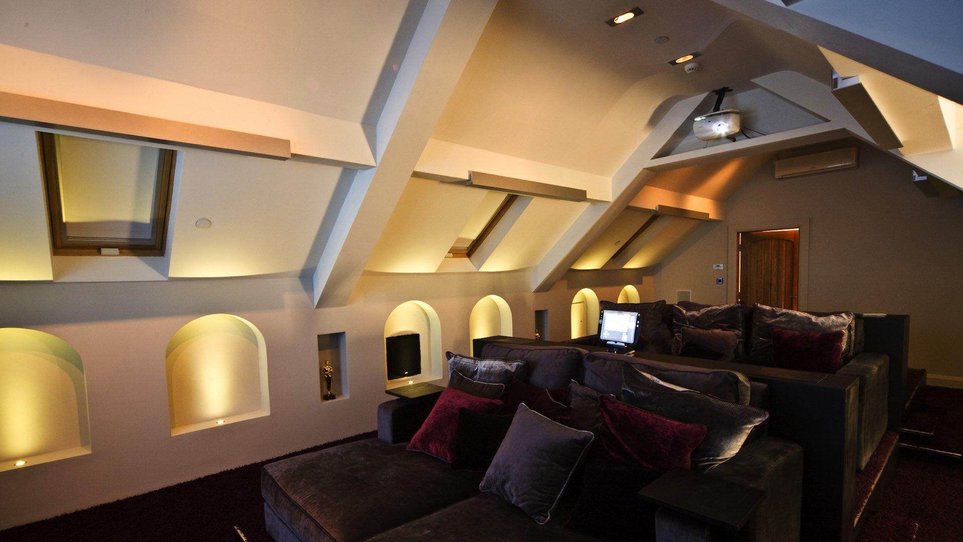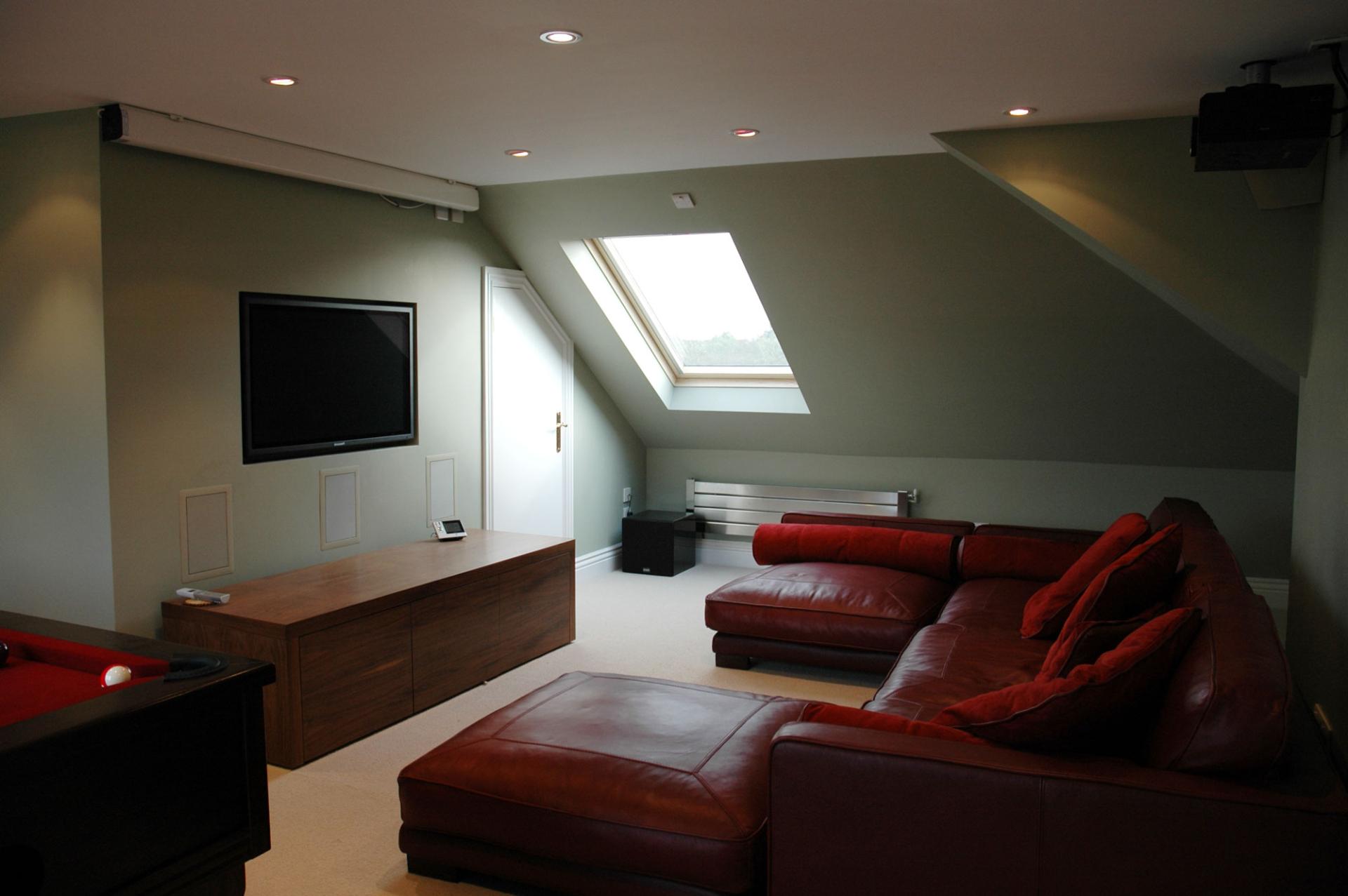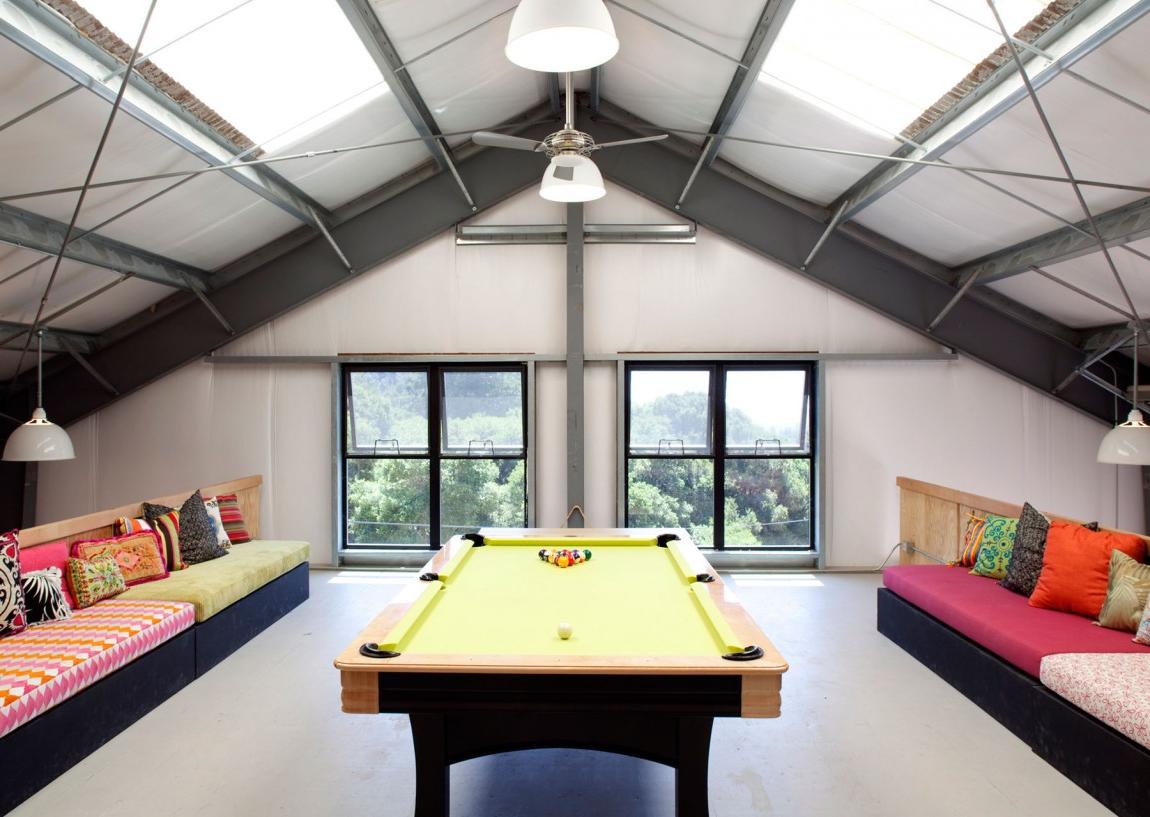 Дизайнеры воплотили мечту любителей провести время с интересом и в спокойной обстановке после рабочего дня или по выходным. Помещение оформлено в доме с плоской крышей, поэтому такое решение можно назвать нетрадиционной мансардой или неполноценным этажом.