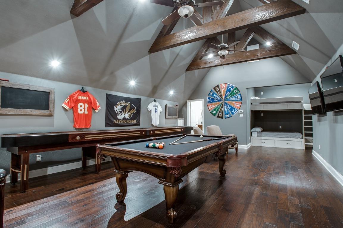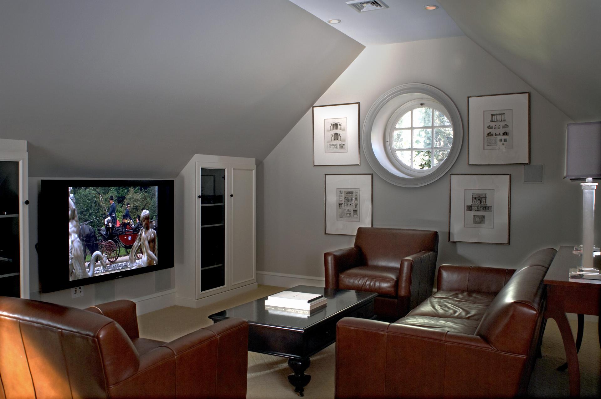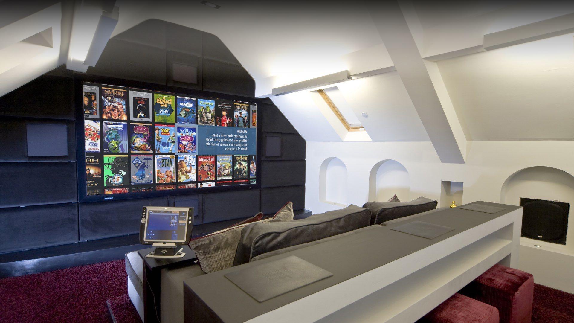 Дизайнеры воплотили мечту любителей провести время с интересом и в спокойной обстановке после рабочего дня или по выходным. Помещение оформлено в доме с плоской крышей, поэтому такое решение можно назвать нетрадиционной мансардой или неполноценным этажом.