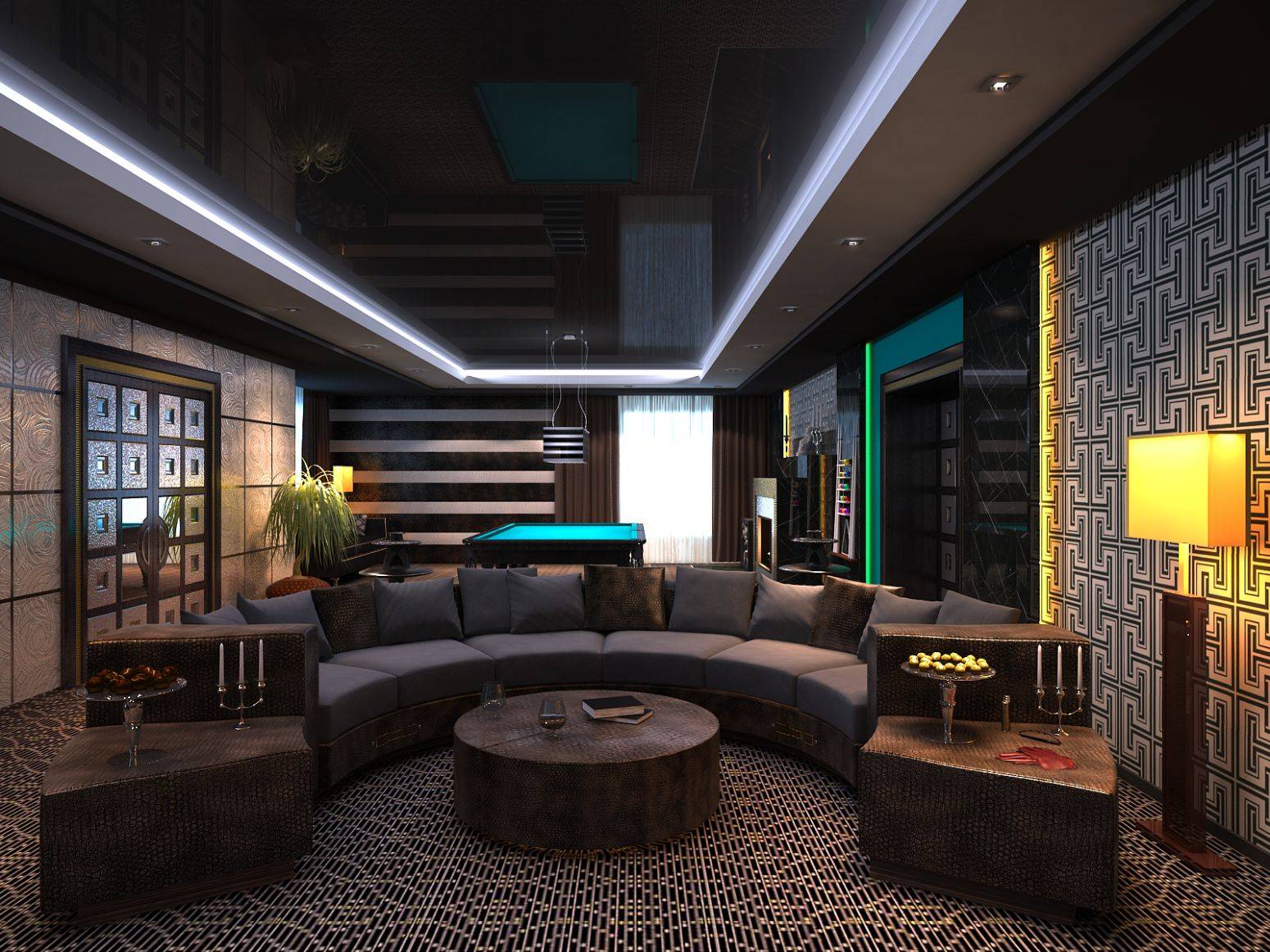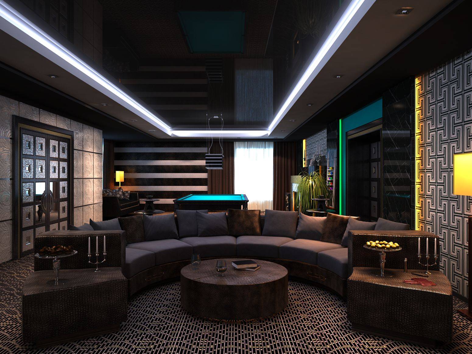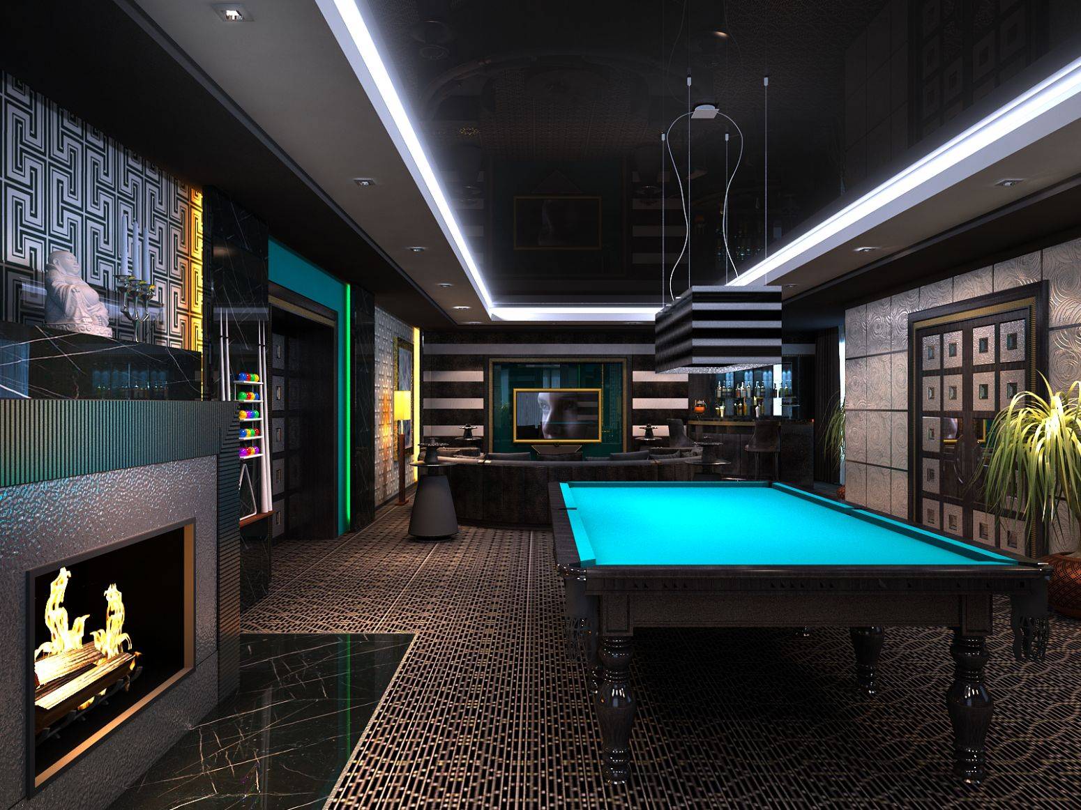 Помещение включает в себя бильярдный стол, домашний кинотеатр, барную стойку и комфортную диванную зону. Обстановка уже сама по себе располагает к отдыху.