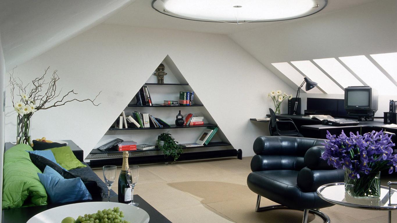 Библиотека в мансарде хороша тем, что под скатами даже в нижних точках можно разместить книжные полки – площадь будет использована с пользой. В такое помещение следует поставить мягкий диван, кресла и журнальный столик. Возле диванной зоны целесообразно поставить торшер. Основное освещение – центральная люстра.