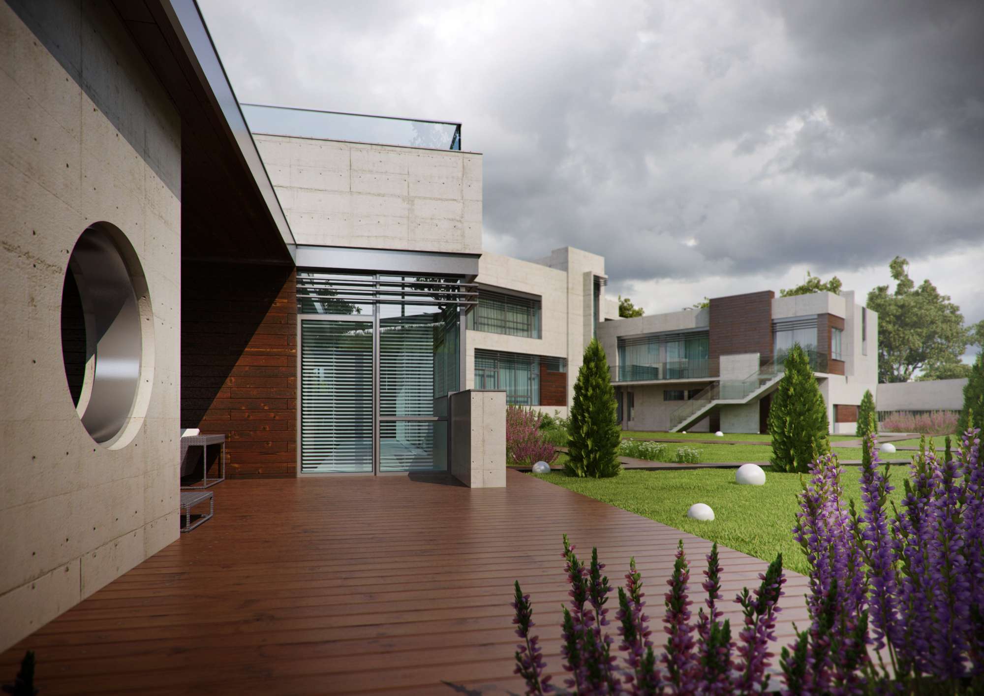 Деревянные дорожки, соединяющие разные входы дома, а также сдержанность в ландшафтном дизайне служат завершающим штрихом этой постмодернистской картины.