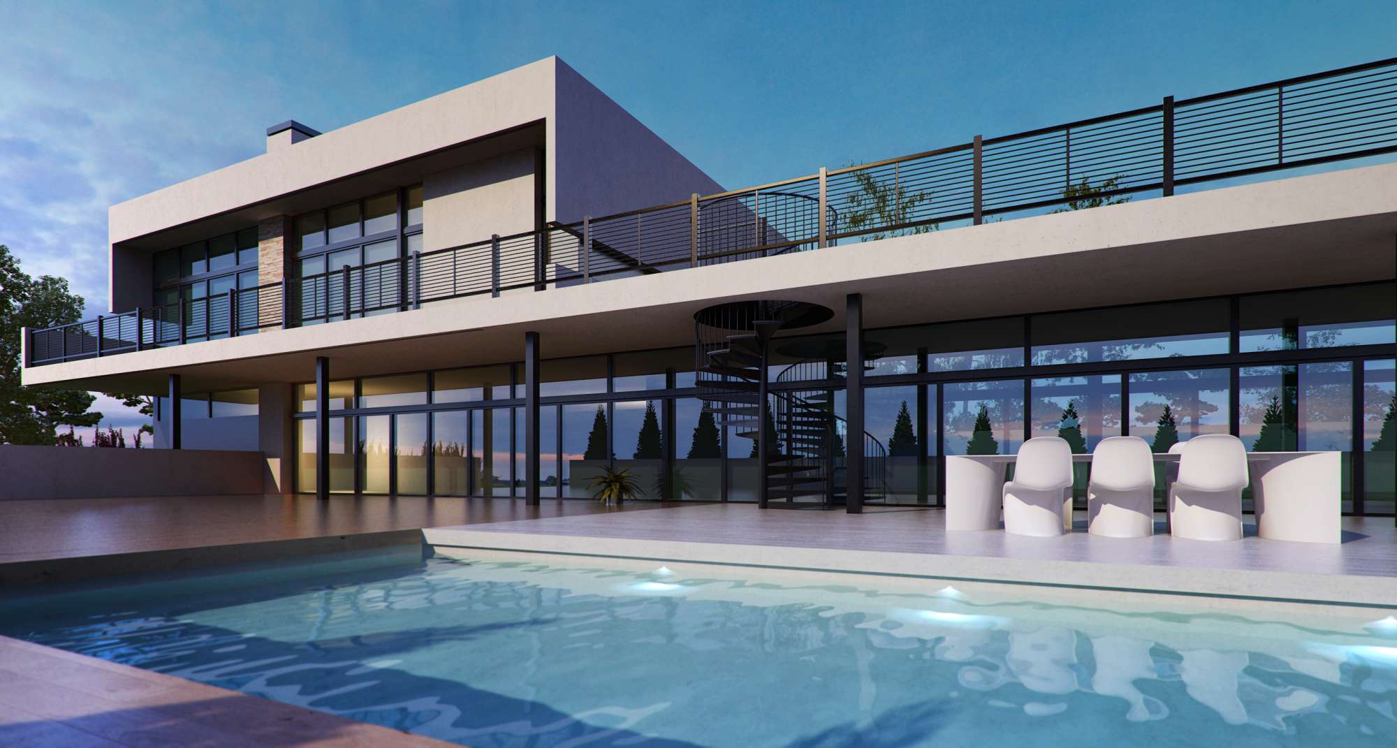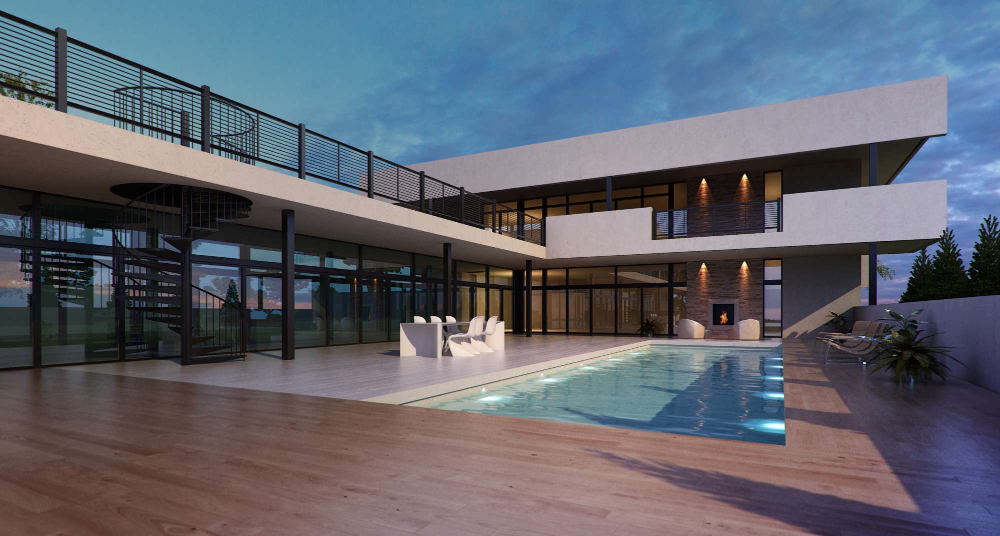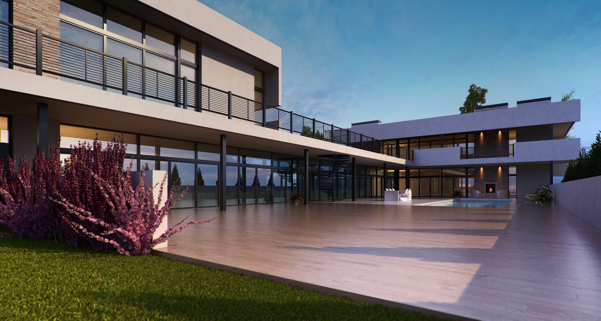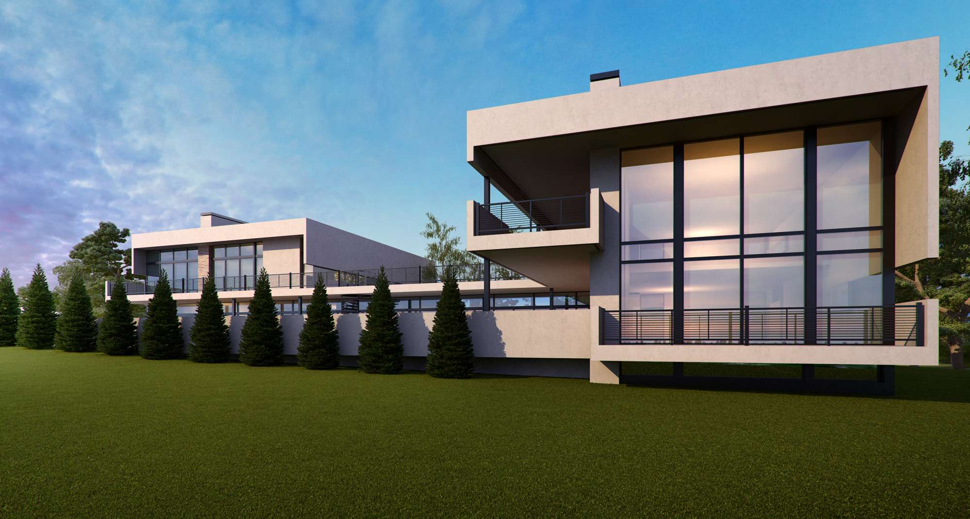 Современный, по-настоящему стильный и роскошный дом выдержан в духе минимализма и позднего модернизма. Все строение выполнено в виде двух корпусов, объединенных между собой прозрачной галереей, сверху которой располагается терраса для отдыха.
