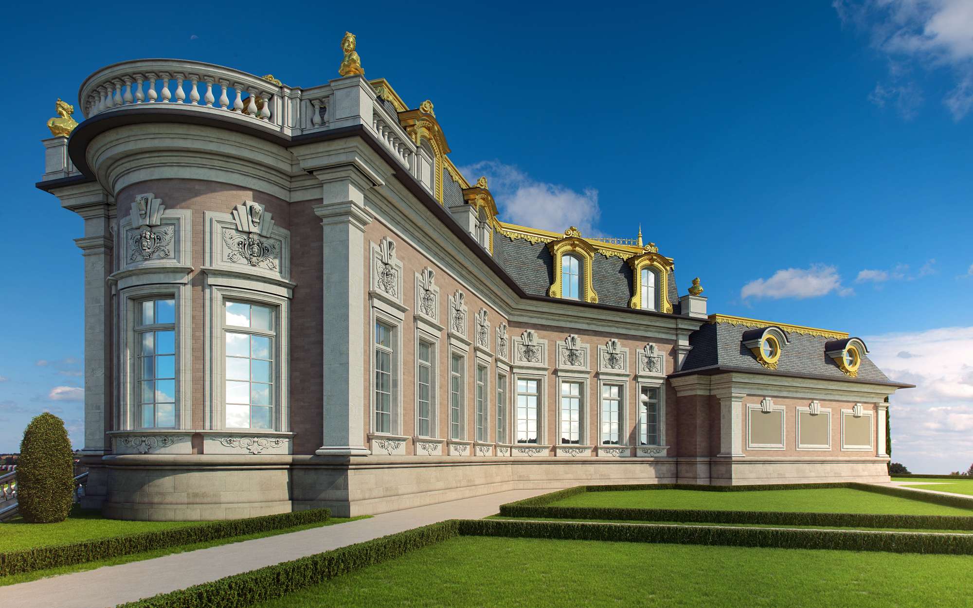 Загородное поместье в виде дворца в парке создано в эклектическом стиле, где объединены различные классические веяния – от античного до модерна. Наиболее подходящие этому поместью эпитеты – роскошное, праздничное, респектабельное.
