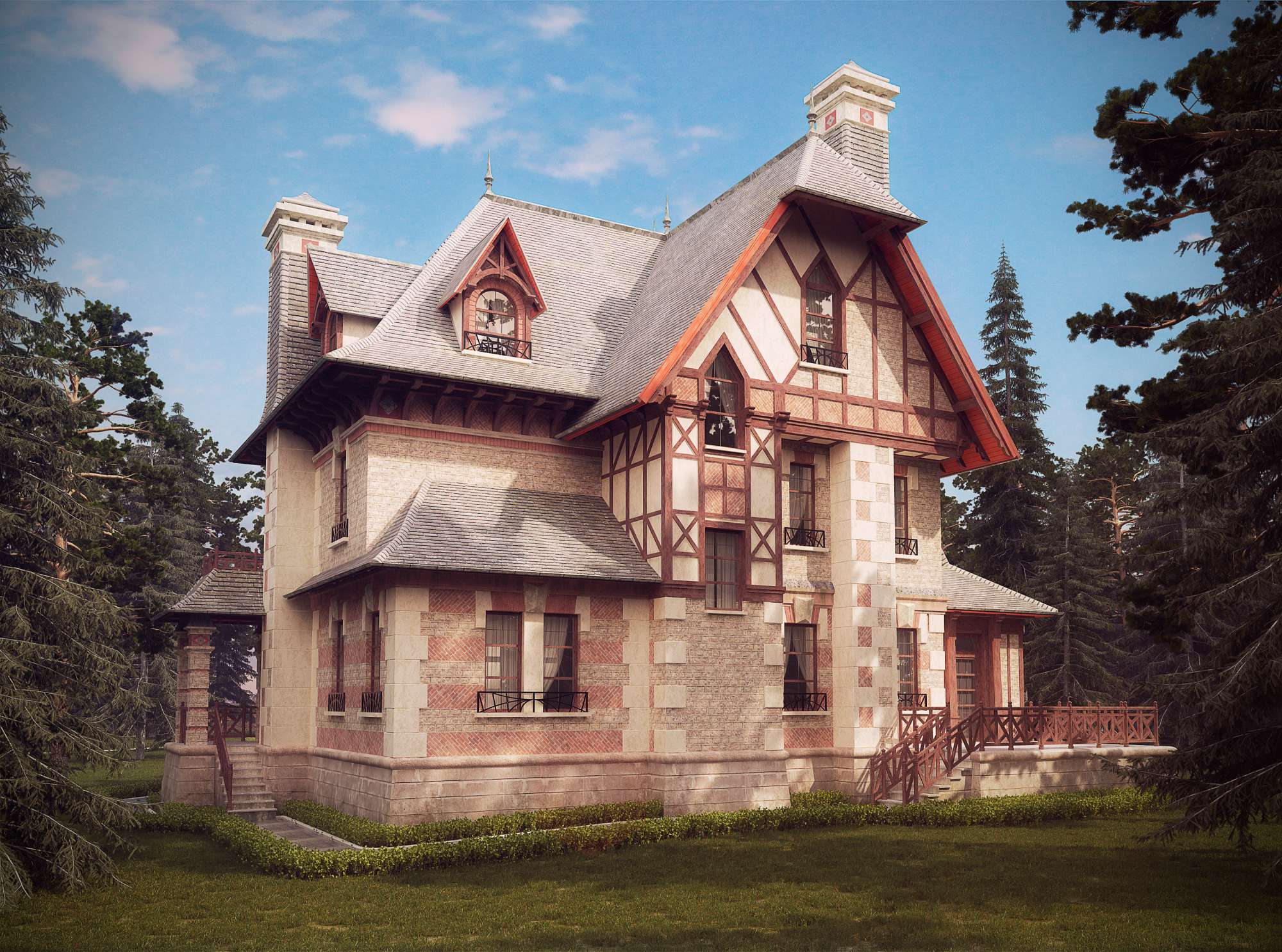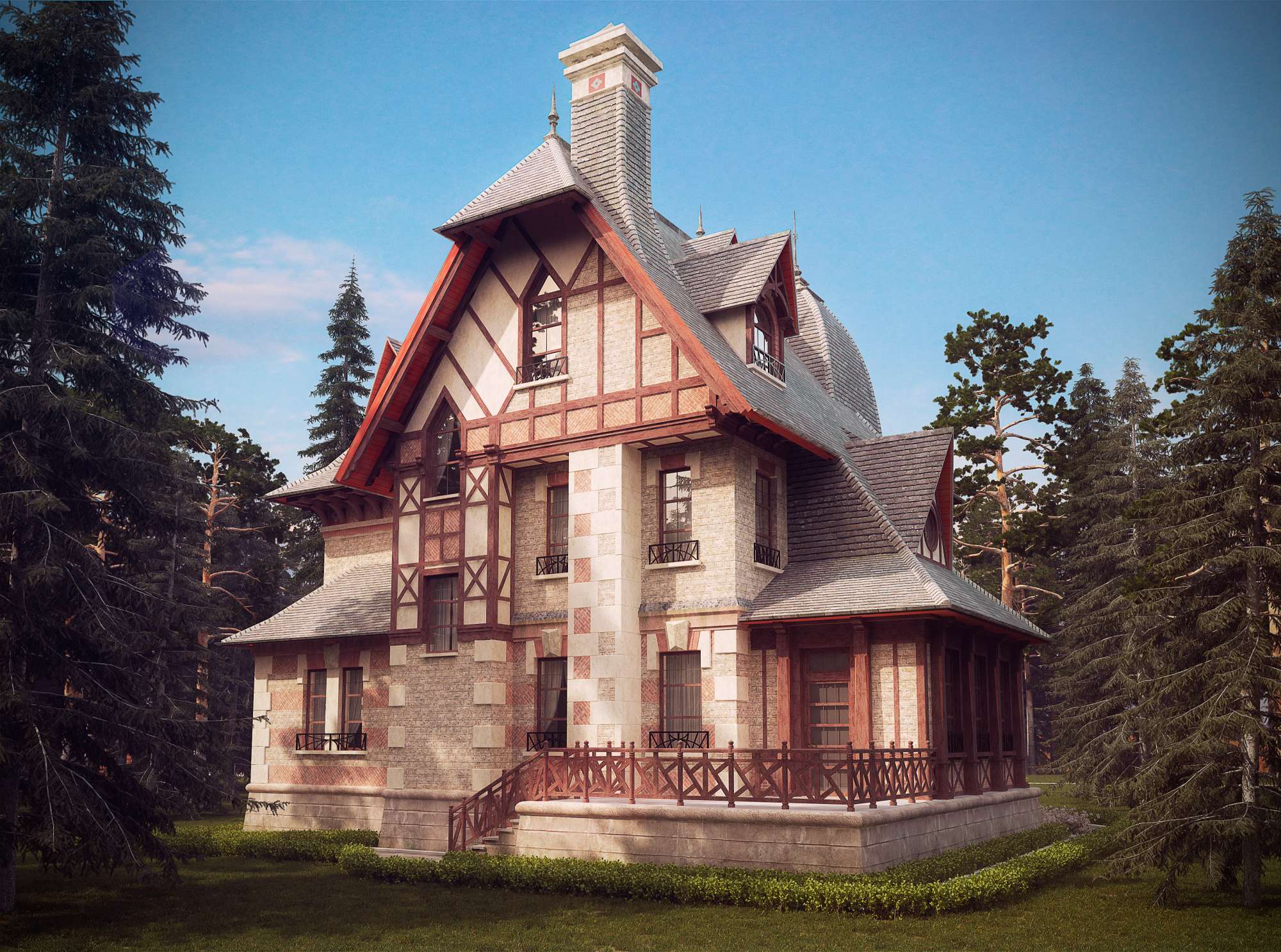 Дом отличает мощный фундамент, массивные каменные стены с декорированием хвойным брусом, сетью из перекрестий деревянных панелей и балок, а также каменной мозаикой. Для облегчения массива в строительстве второго и мансардного этажа используется деревянный каркас.