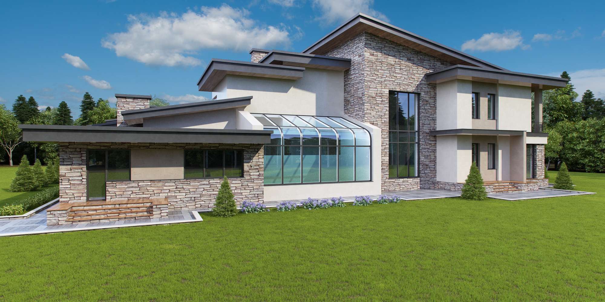 Декор дизайна экстерьера фасада частного дома обусловлен архитектурной пластикой конструктивных частей сооружения и всего строения в целом. Оштукатуренные белые поверхности подчеркнули пространственную сложность здания. А использование в отделке натурального камня позволило визуально выделить отдельные горизонтальные и вертикальные плоскости, усилив образную экспрессивность особняка.