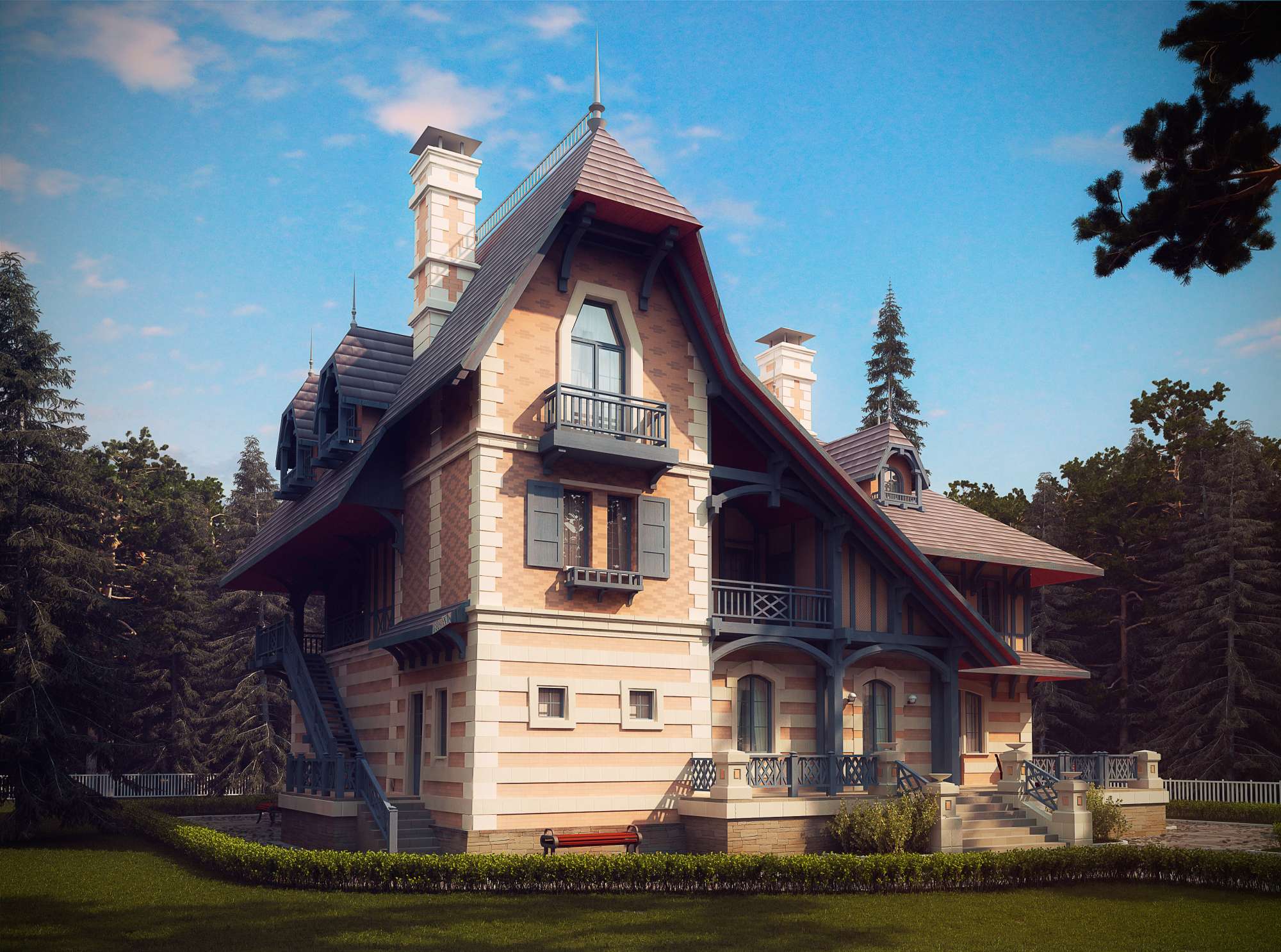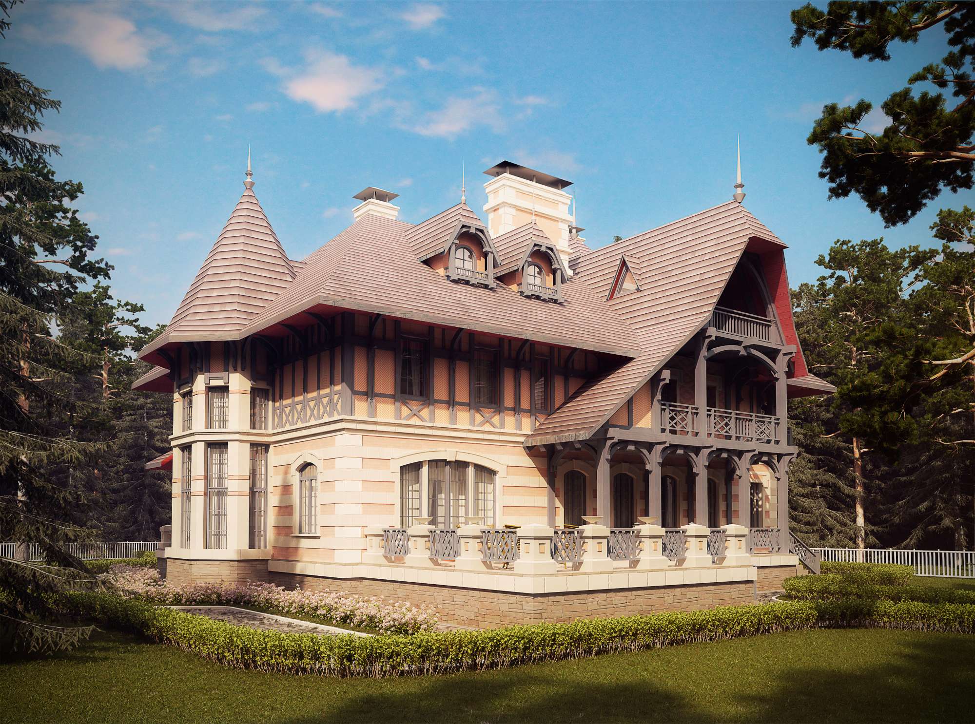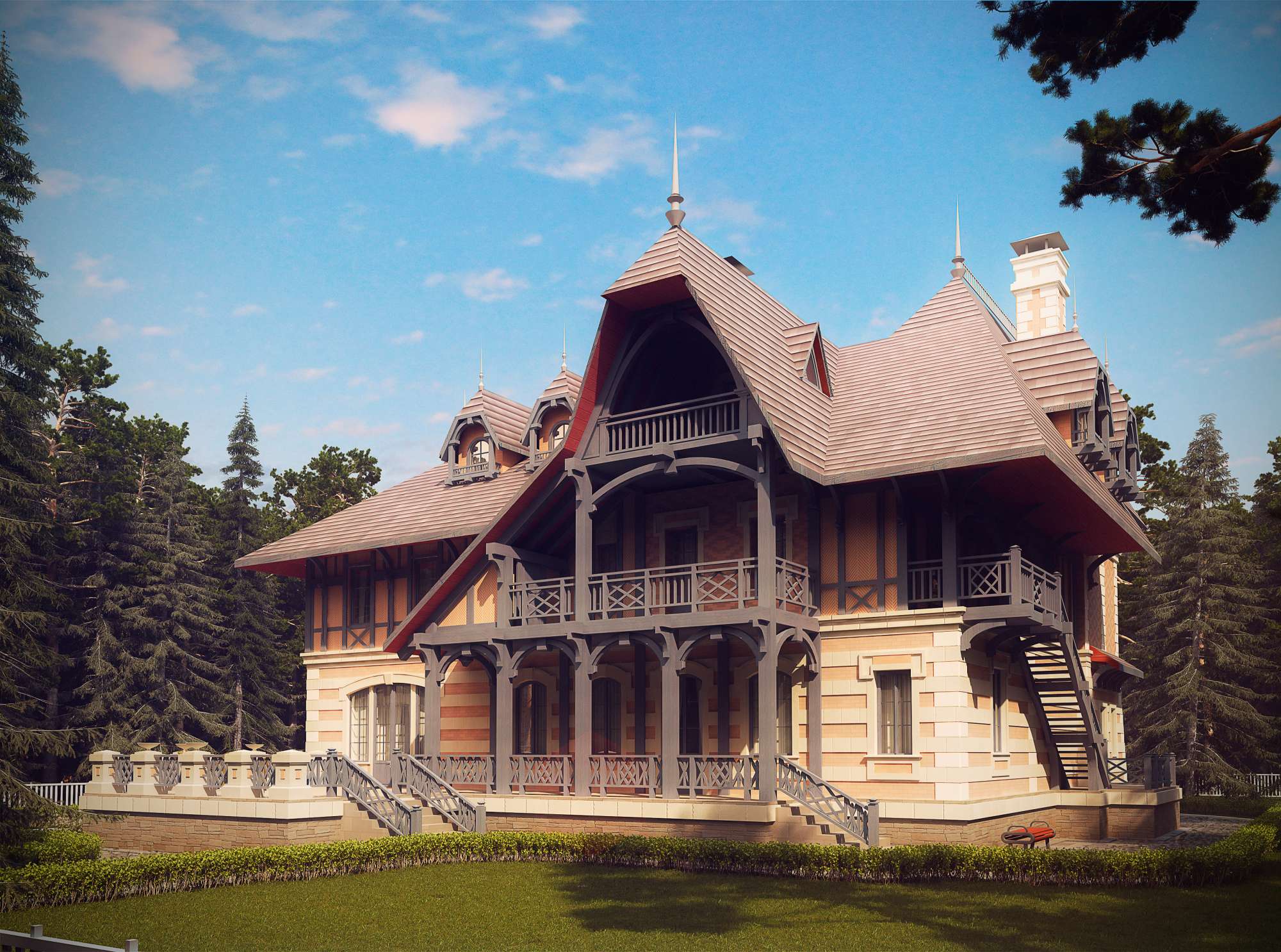 Большие террасы и многочисленные крытые балконы, размещенные по всему периметру декоративных фасадов частного дома, открыли особняк окружающему его пространству, образовав уютные площадки для уединенного отдыха.