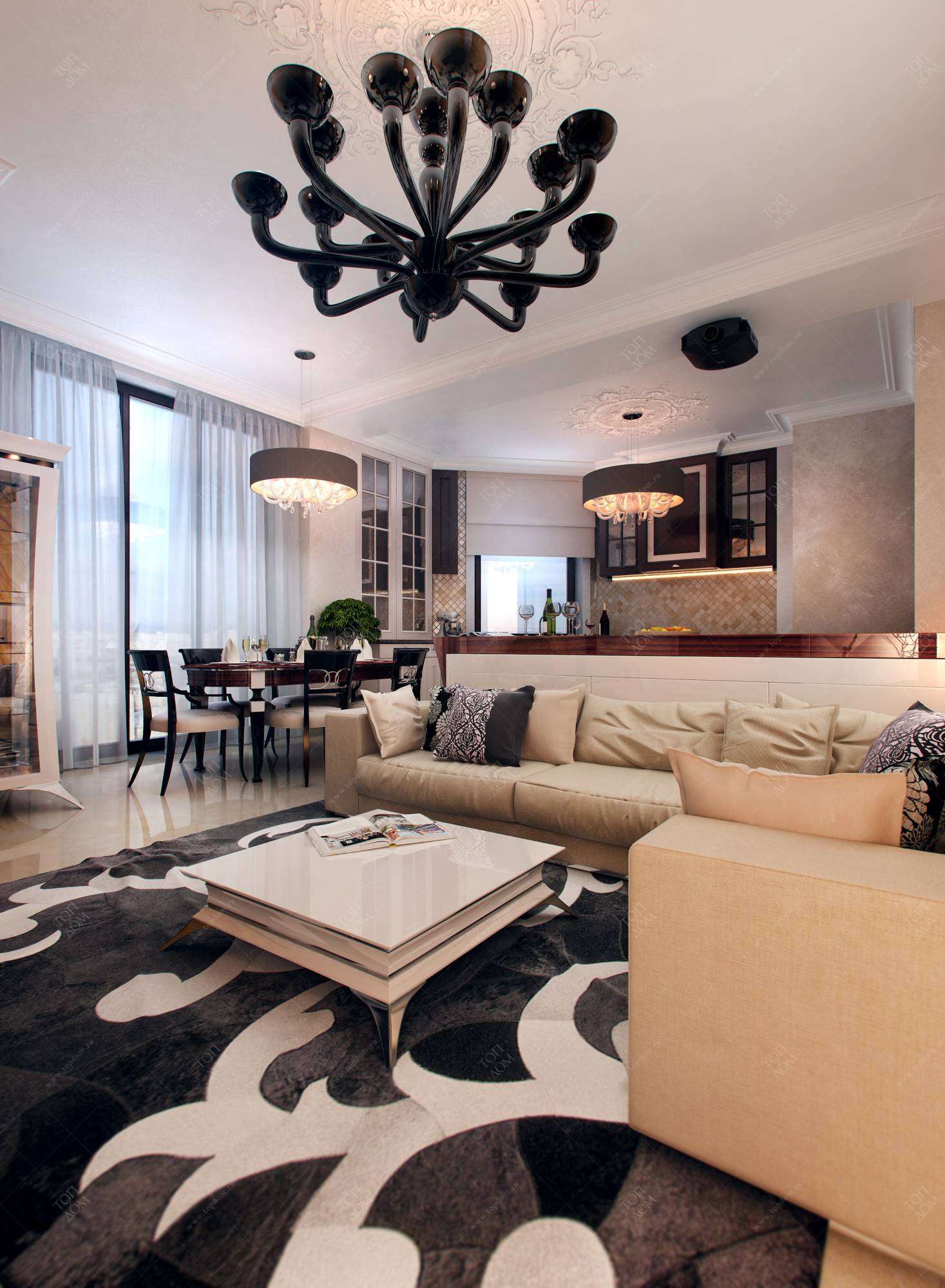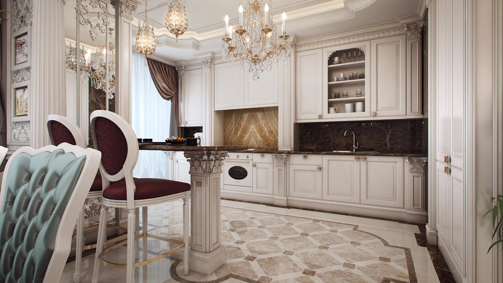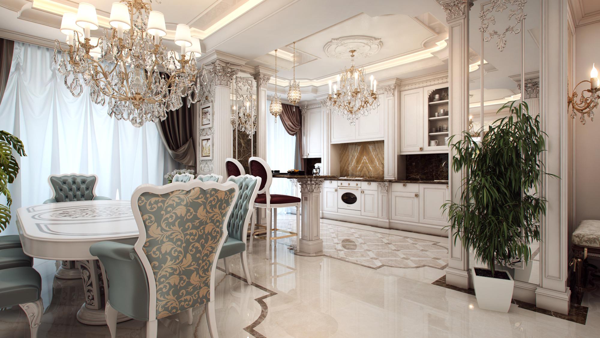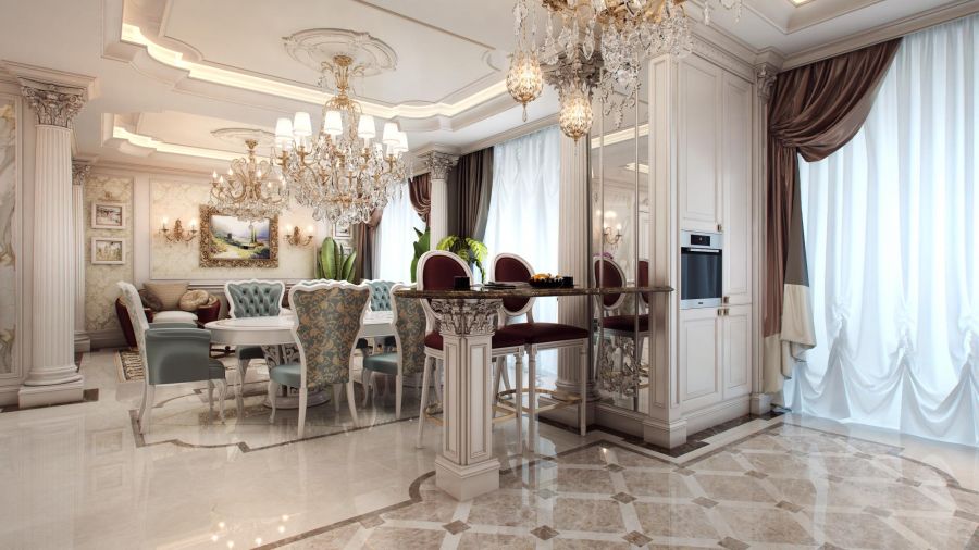Проект интерьера дорогой квартиры – вид дворцового оформления, которое идеально подойдет для элитного жилья площадью от 500 кв. м. Задача создать роскошную обстановку решается не обилием позолоты, а элементами античного стиля: декоративной лепнины, резной мебели, мраморной облицовки, многослойной драпировки, классического чистого белого цвета. Особое внимание уделяется меблировке, где массивные диваны и кресла с великолепной резьбой соседствуют с образчиками римской архитектуры в дизайне кухонного гарнитура.