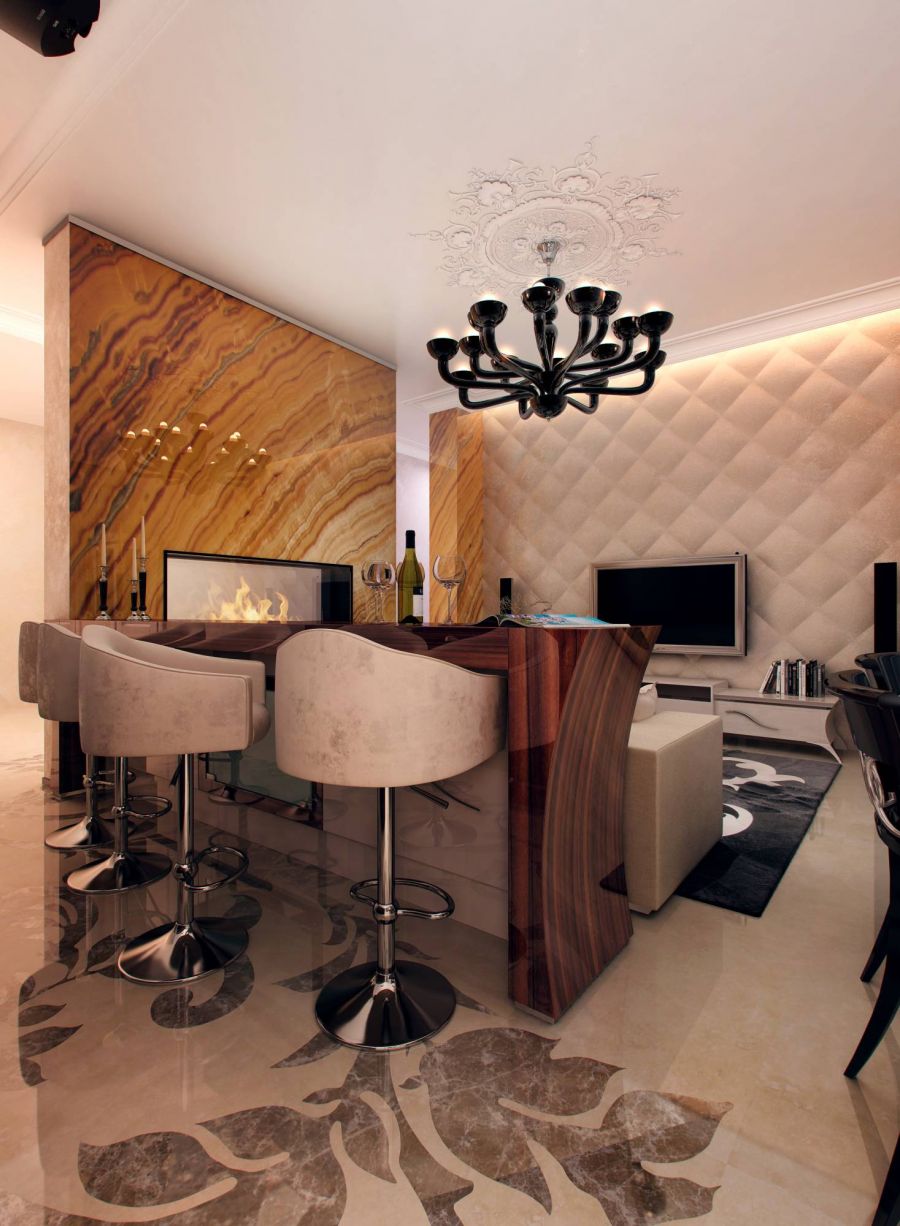 - на кухне – коричневая мраморная облицовка и бархатные барные стулья винного оттенка;