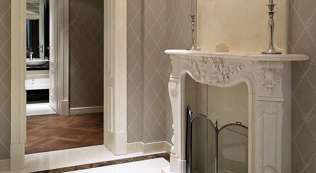 Следующий дизайн интерьера новой квартиры с классической отделкой – пример того, как традиционная стилистика легко ассимилируется с современной. Если в помещении ванной комнаты и кухни преобладают глянцевые ровные поверхности, сочетания молочных стен и темных гладких деревянных панелей, то коридор и холл получили изящное убранство – паркет «елочкой», пилястры, каминный портал и строгие серые обои.