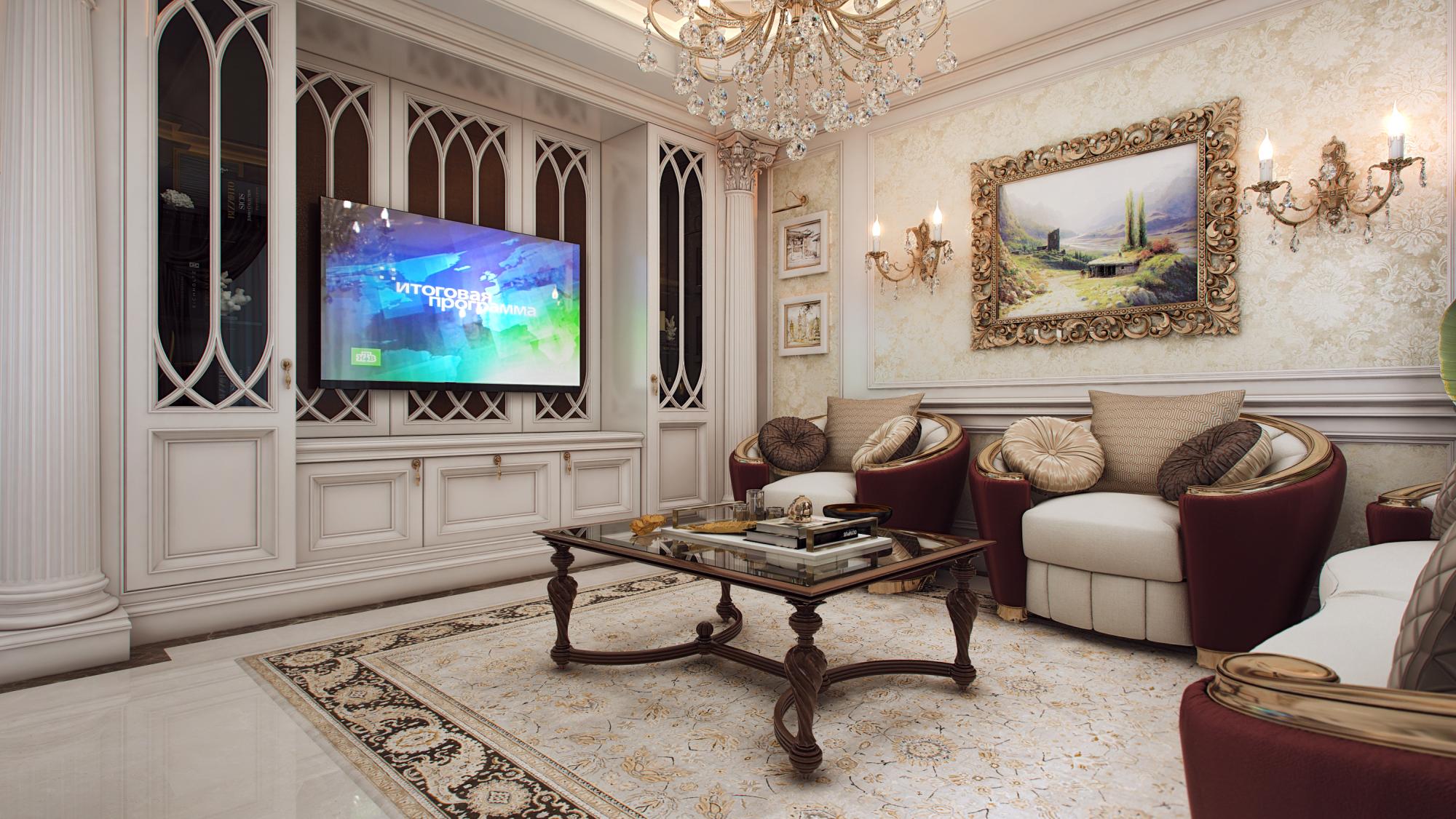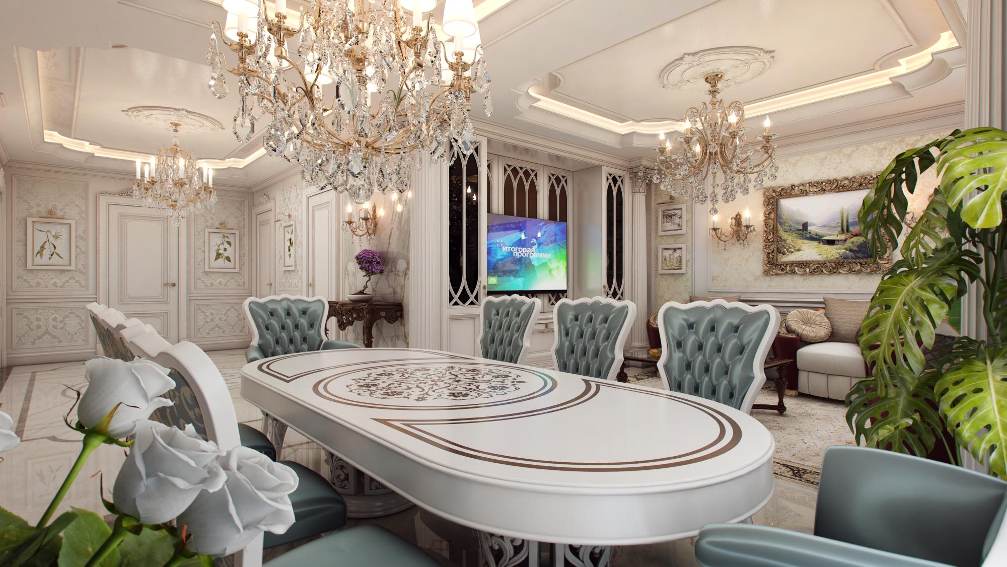 За счет объединения пространства, использования светлой палитры и богатого декора обстановка выглядит парадной, как и положено традиционному окружению. А установка встроенной техники на кухне и в ТВ-зоне воплощает уровень комфорта для современного городского жителя.