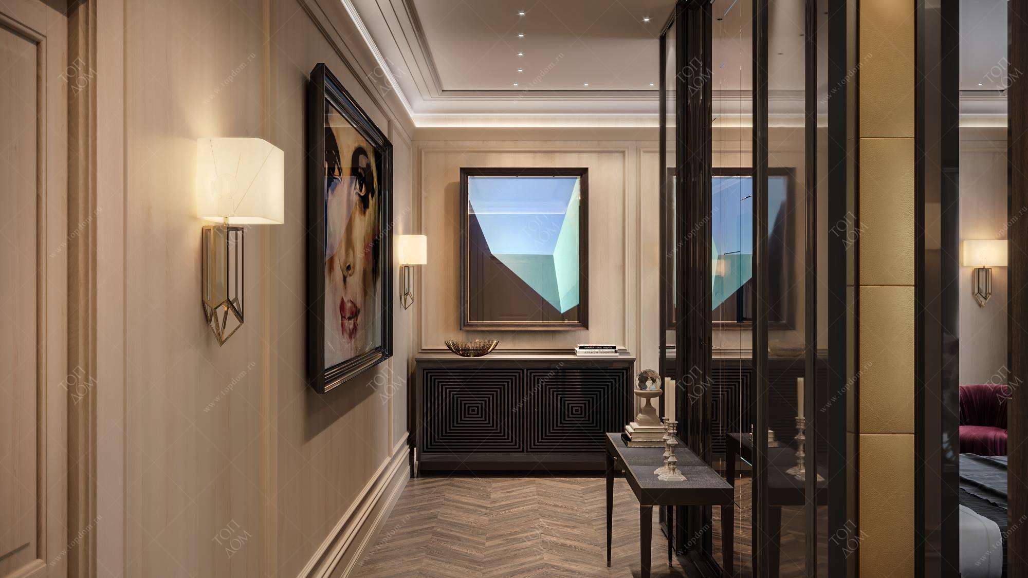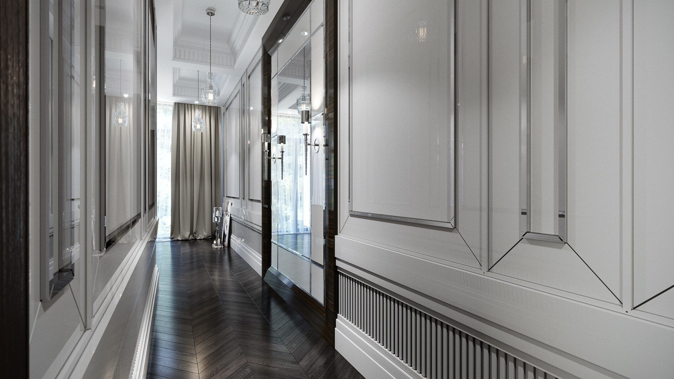Характерный для стиля акцент на геометрию отчетливо обозначен в оформлении стен. Белые квадратные и прямоугольные лакированные панели с блестящими кантами создают ритмический рисунок, который тематически связывает основное помещение с коридором. Нижний бордюр из рельефных вертикальных планок перекликается с декором потолочных ниш. Объем вытянутого коридора корректирует зеркальное полотно с подсветкой бра.