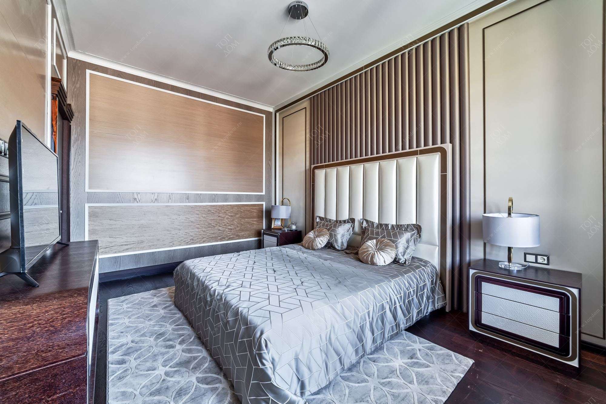 В реализованном проекте красивого ремонта в частном доме спальня выдержана в благородных коричнево-бежевых оттенках. Тональность задают настенные деревянные и кожаные рельефные панели. Концентрацию декоративных элементов в отделке поверхностей и мебели компенсирует гладкий белый потолок со светильником-кольцом.