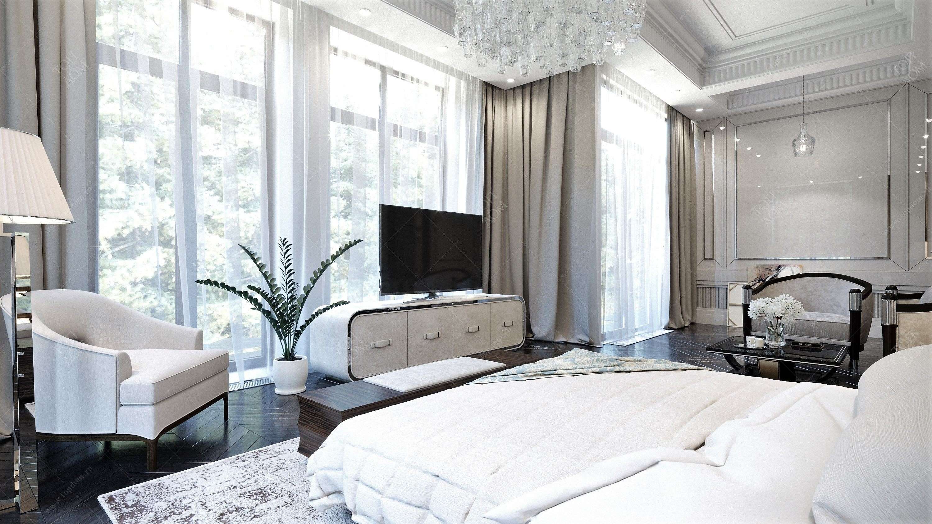 Симметрию вокруг кровати создают прикроватные тумбы, банкетка или софа в изножье. Массивные платяные шкафы используются редко, в роли систем хранения уместнее комоды и тумбы с гладкими лакированными фасадами. Зону туалетного столика обозначают большое зеркало и кресло интересного силуэта.