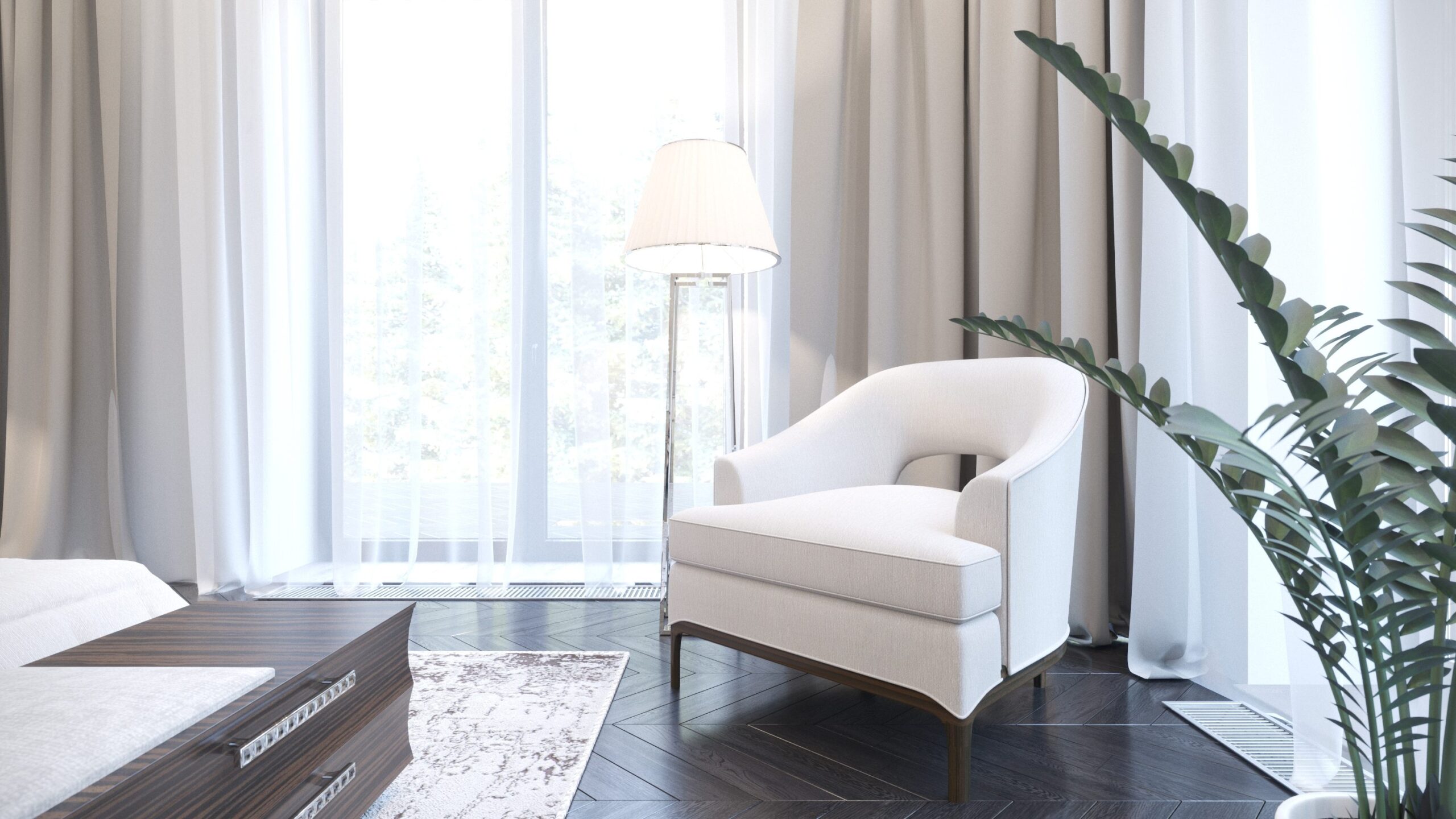 Нейтральный светлый серо-белый фон создают глянцевые стены, мягкая мебель (диваны в зоне дневного отдыха, кресло у окна) и простые по декору, но многочисленные шторы, которые присутствуют здесь в изобилии.