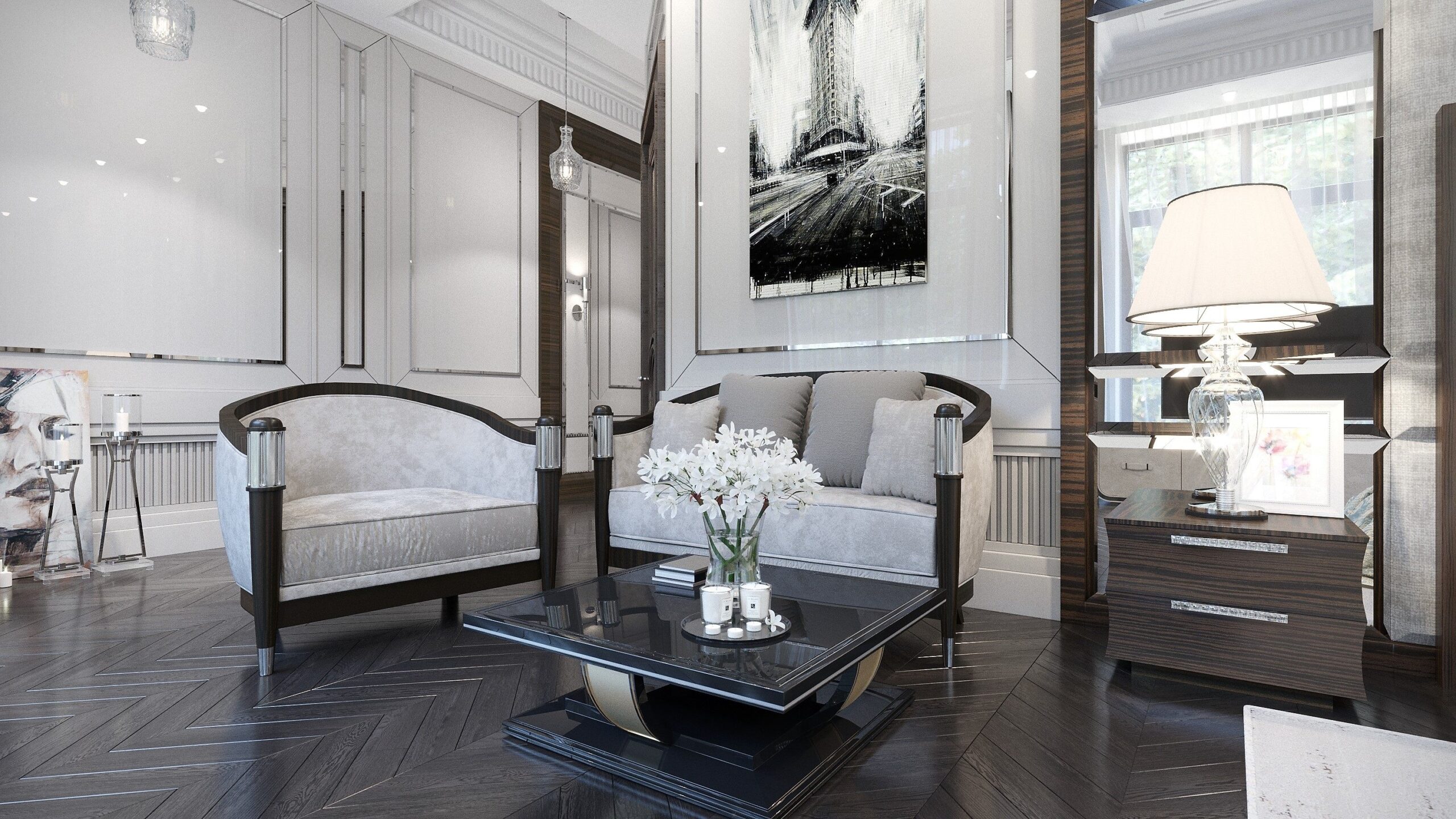 Пример современной спальни арт деко в сером цвете можно найти в проекте красивых интерьеров квартиры. Спокойный тон задают текстильное убранство, прикроватные тумбы, ковер, туалетный столик. Белые фигурные панели за изголовьем кровати – нарядное дополнение, как и высокие зеркала, золотистые светильники.