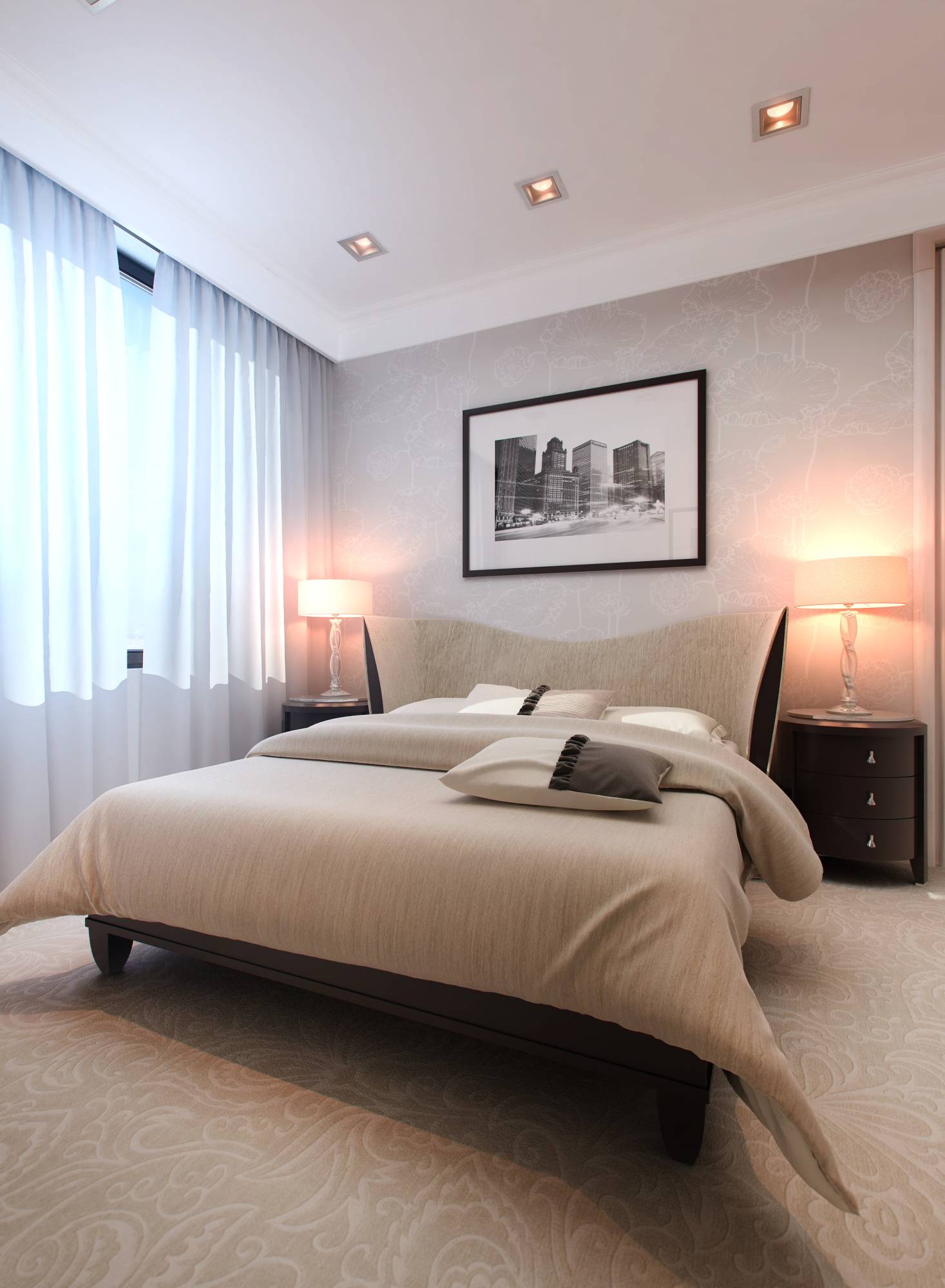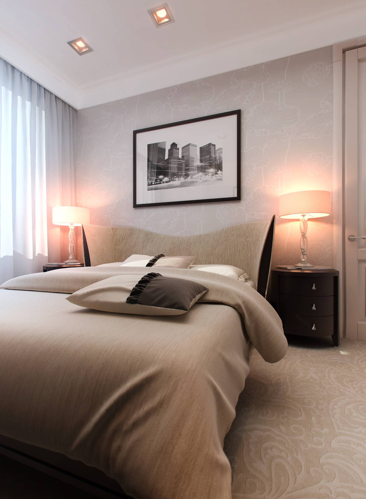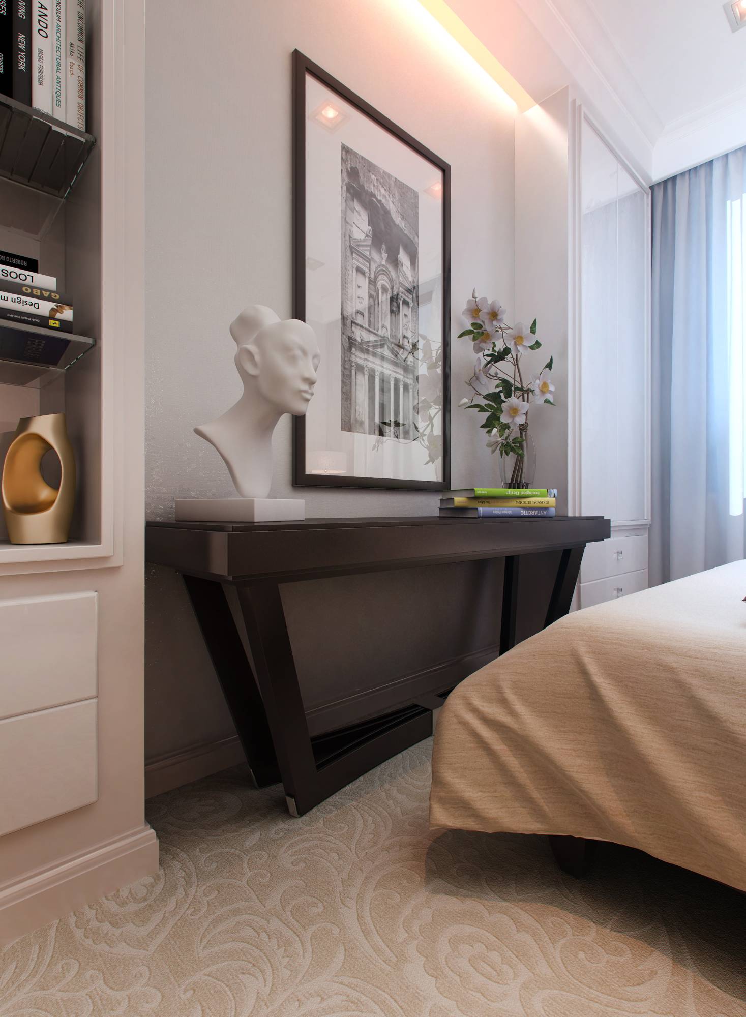 В светлых бежевых тонах выдержан строгий интерьер спальни в квартире в стиле ар-деко. От ТВ-зоны здесь решено отказаться, ее традиционное место напротив кровати отводится изящному столику и большой черно-белой репродукции.