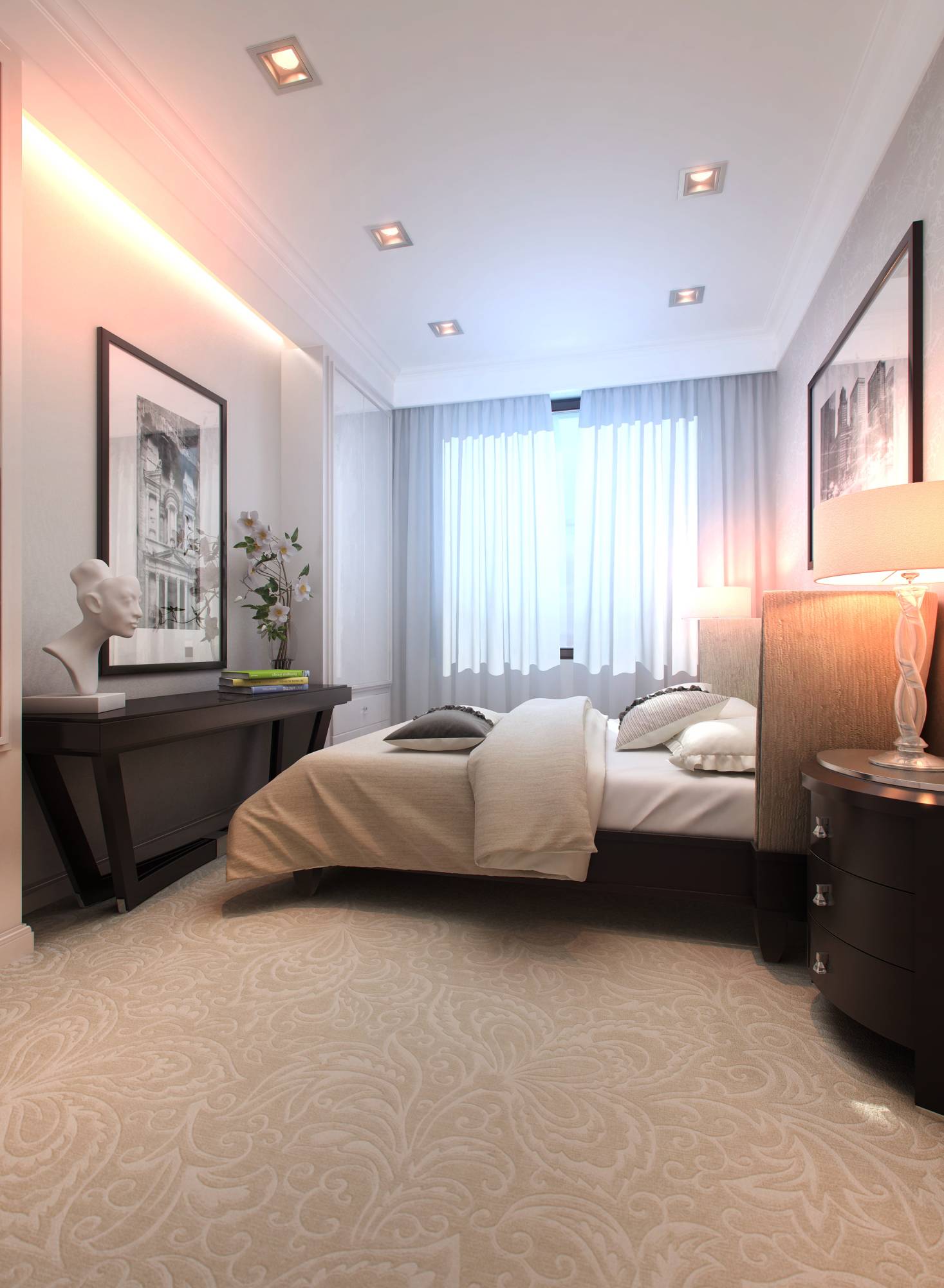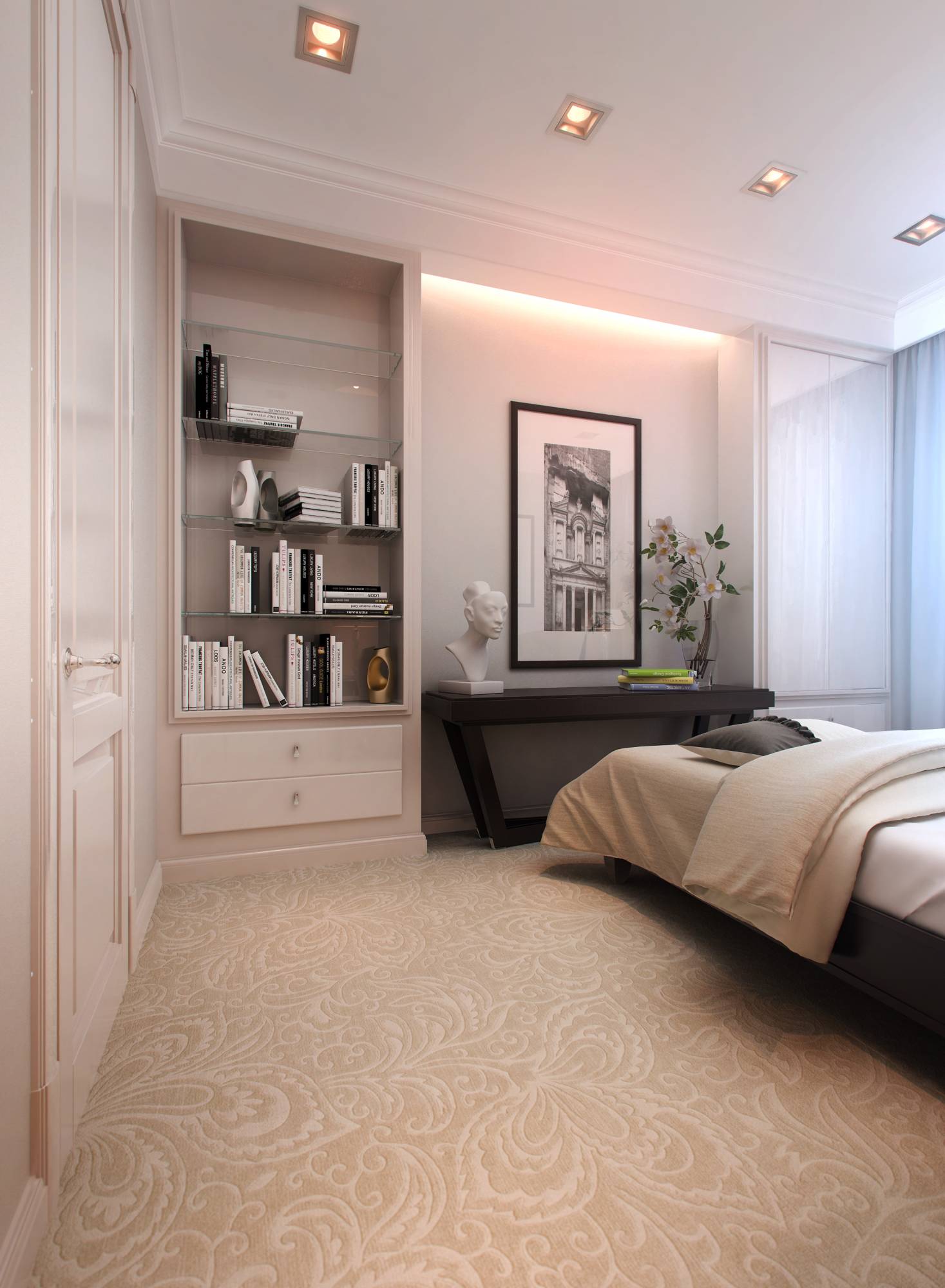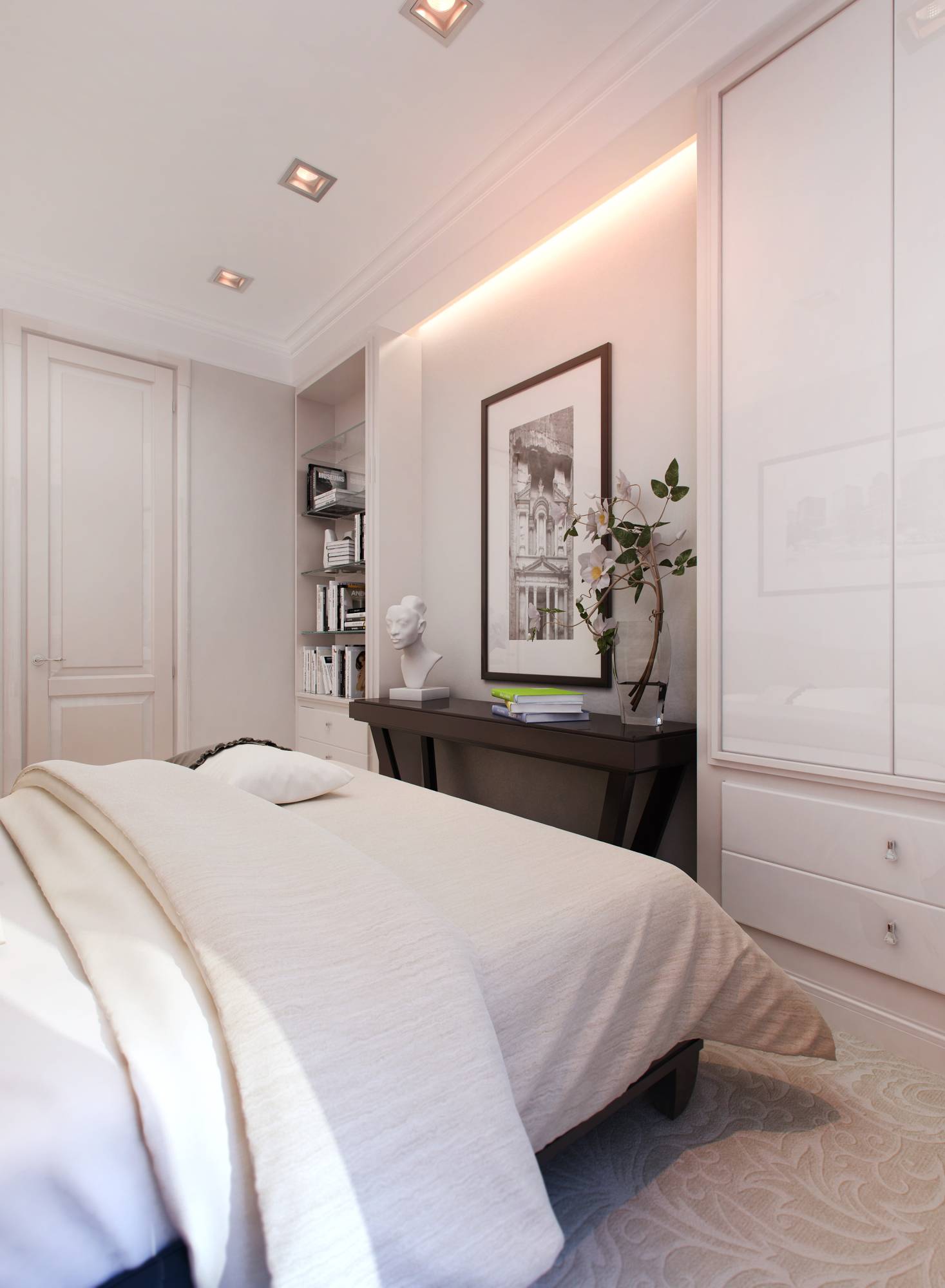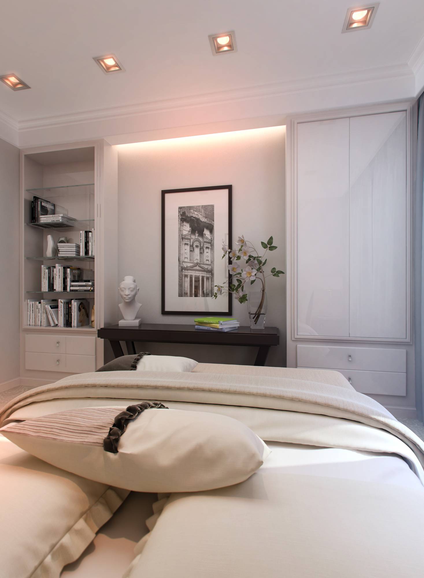 В светлых бежевых тонах выдержан строгий интерьер спальни в квартире в стиле ар-деко. От ТВ-зоны здесь решено отказаться, ее традиционное место напротив кровати отводится изящному столику и большой черно-белой репродукции.