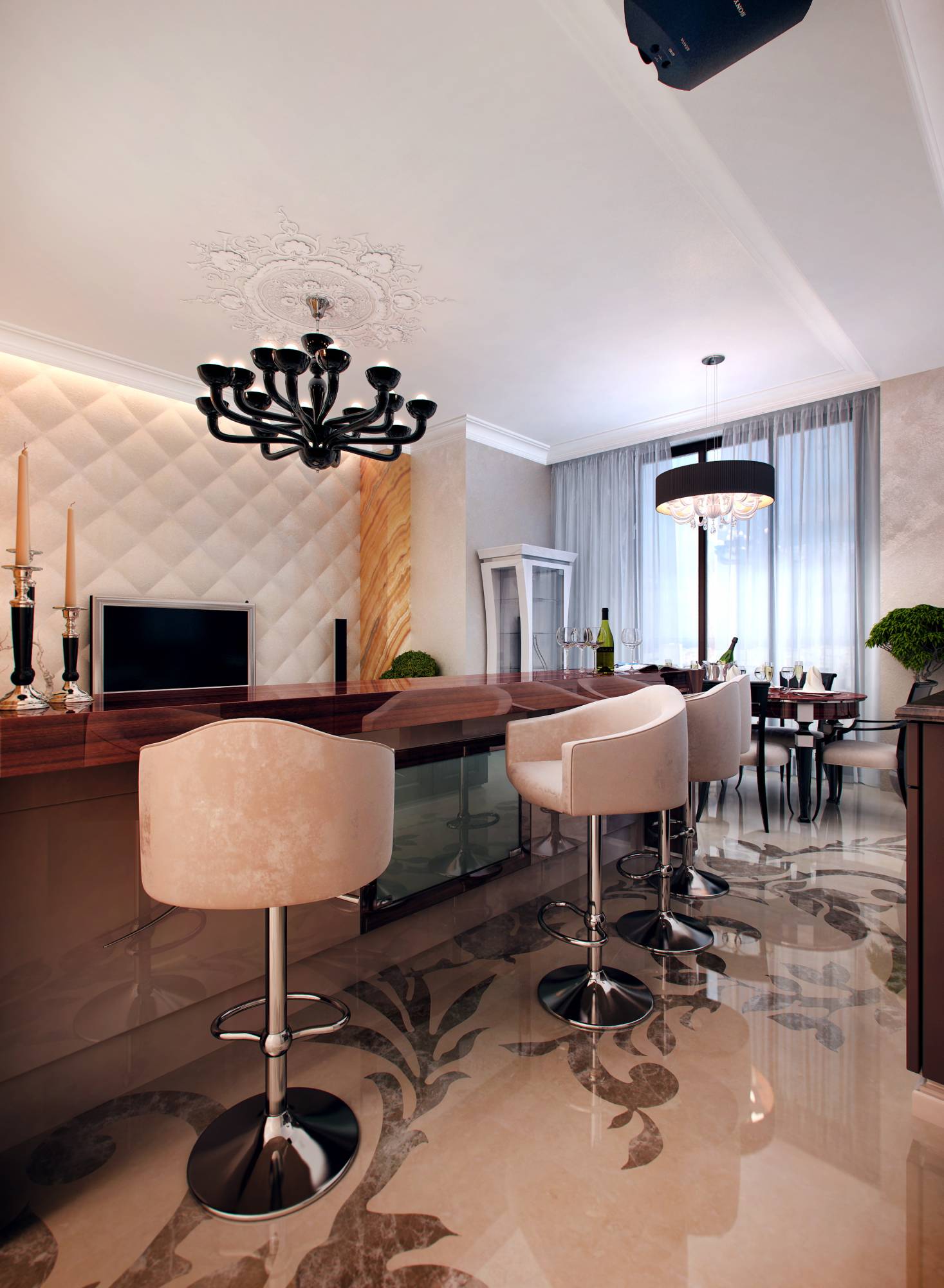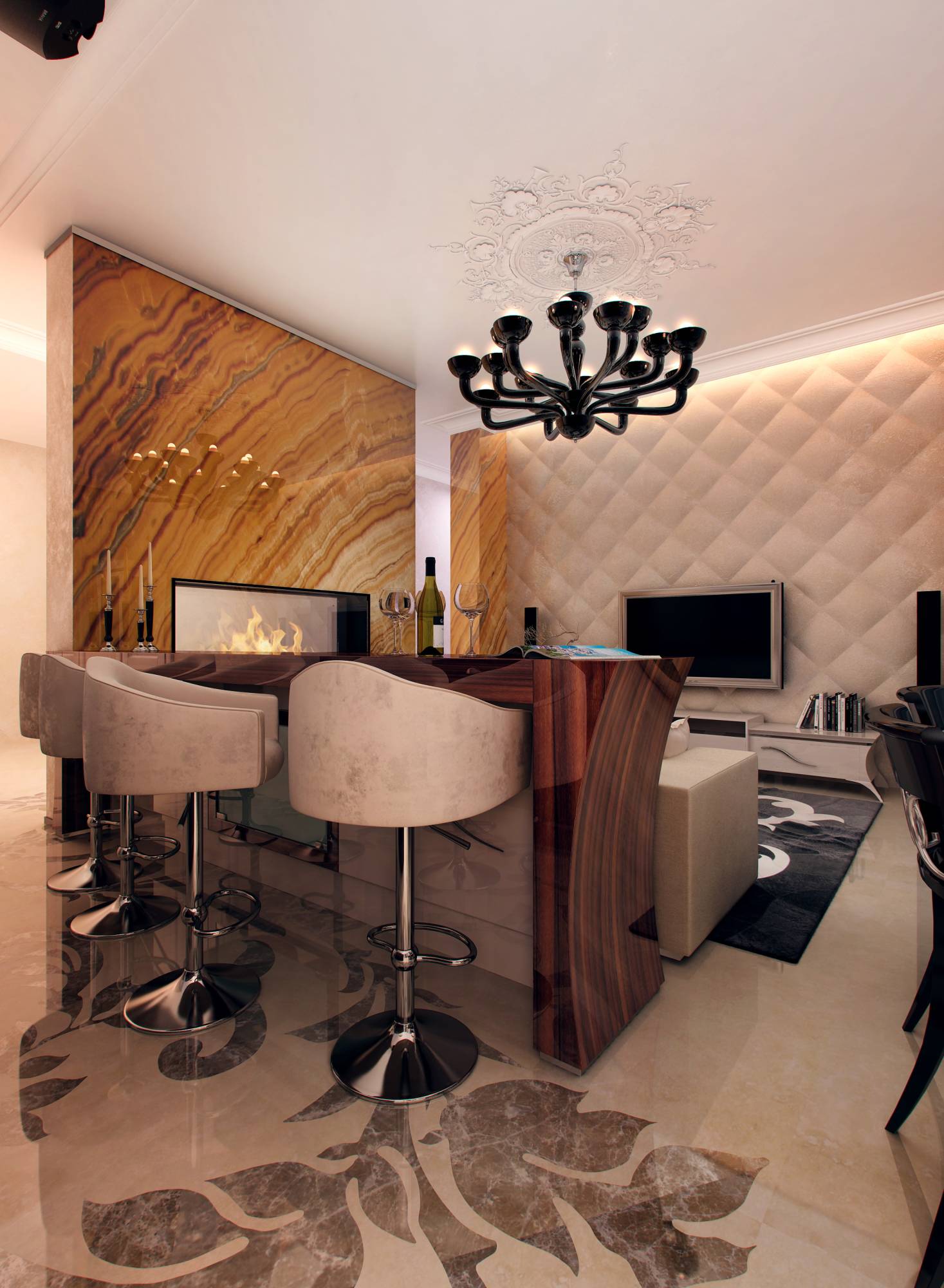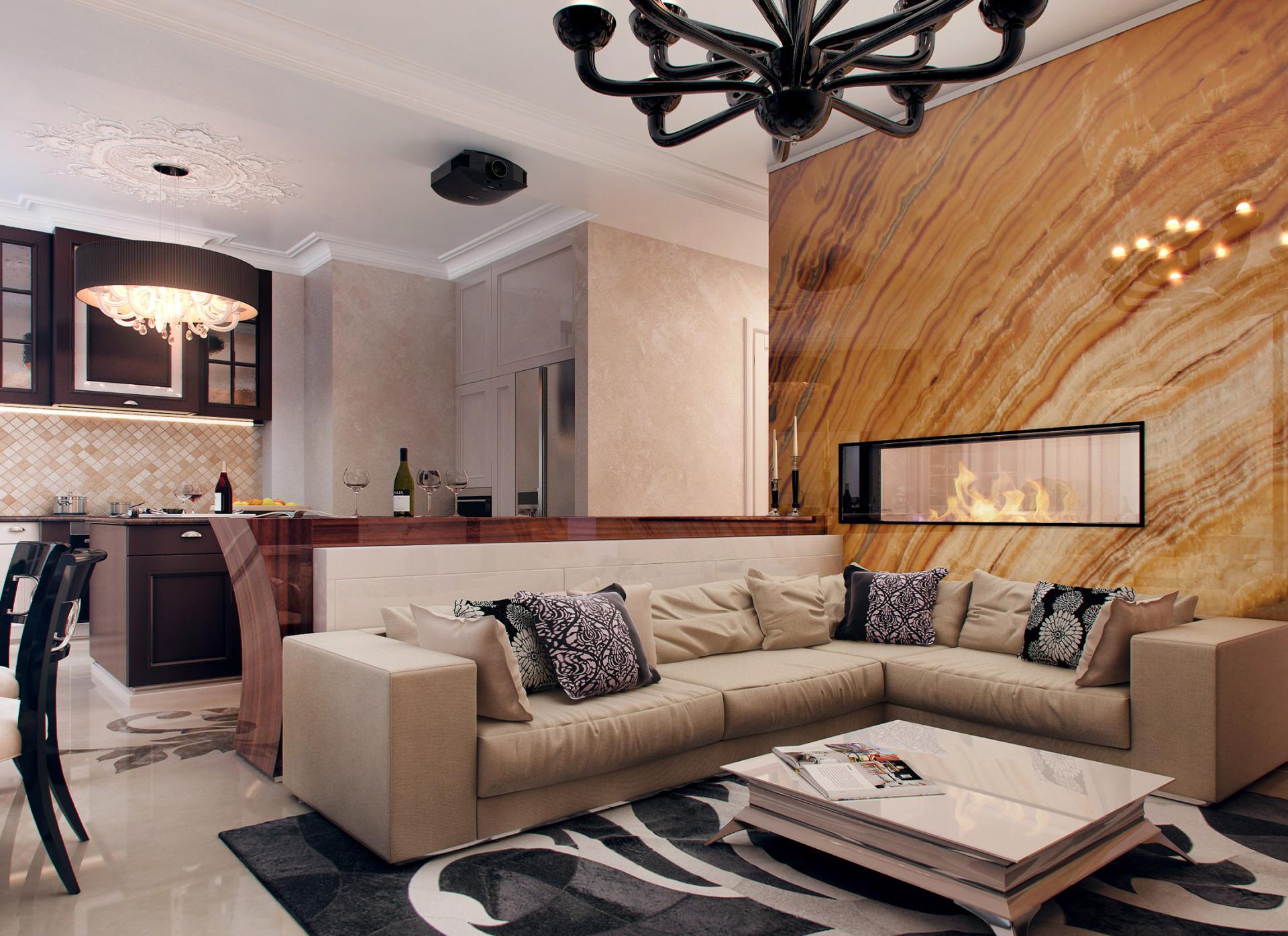 Пространство гостиной-столовой по проекту отделяется от входной зоны широкой перегородкой, облицованной ярким ониксом. Со стороны гостиной в перегородке сделана каминная ниша, идущая параллельно диванной спинке. За другой спинкой углового дивана размещена барная стойка, акцентированная крупным напольным орнаментом.