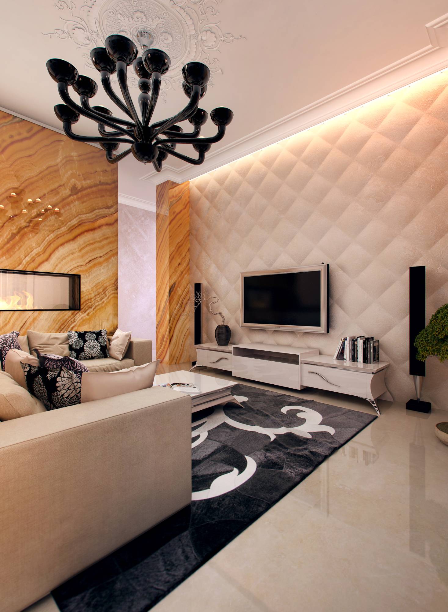 Стена в ТВ-зоне обрамлена ониксовыми колоннами и обшита фактурной кожаной панелью белого цвета. Светлые бежевые оттенки доминируют в оформлении гостиной, на контрасте выступают напольный рисунок, элементы текстиля, люстра антрацитового цвета.