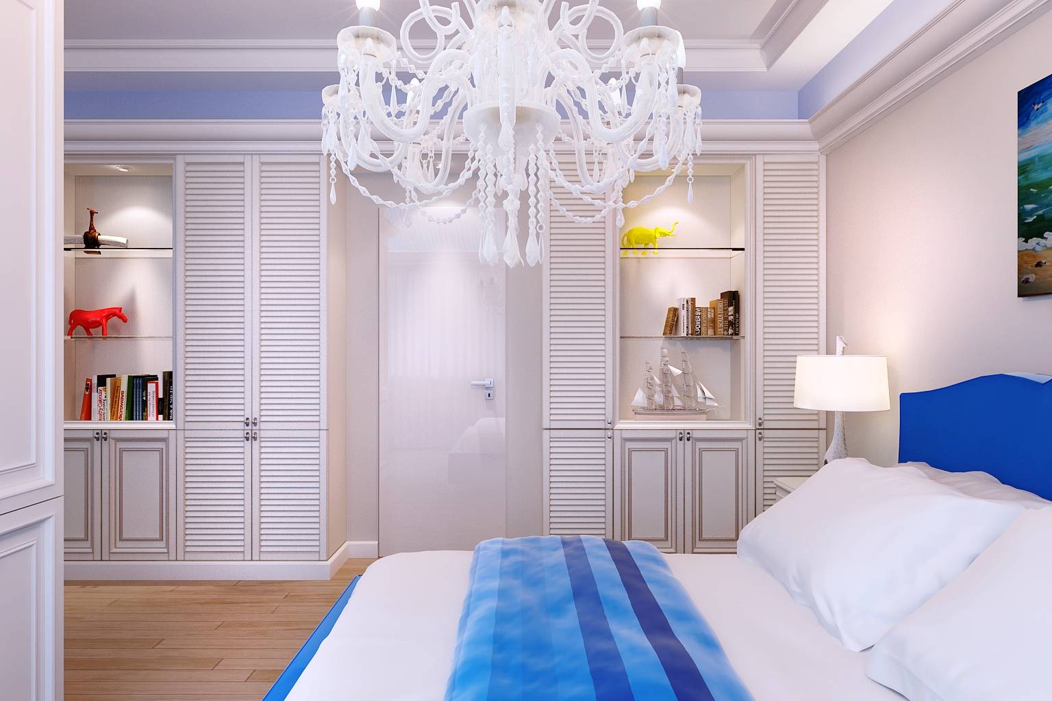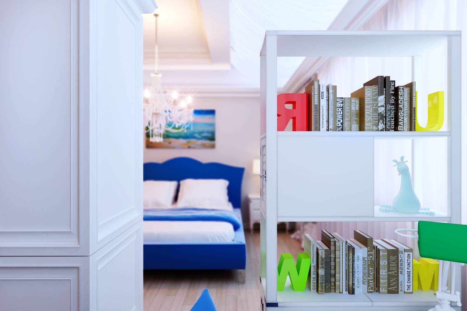 Интерьер детской для мальчика представлен в двух вариантах: в неоклассическом стиле и в более минималистском ключе с яркими синими акцентами в цветовой гамме.