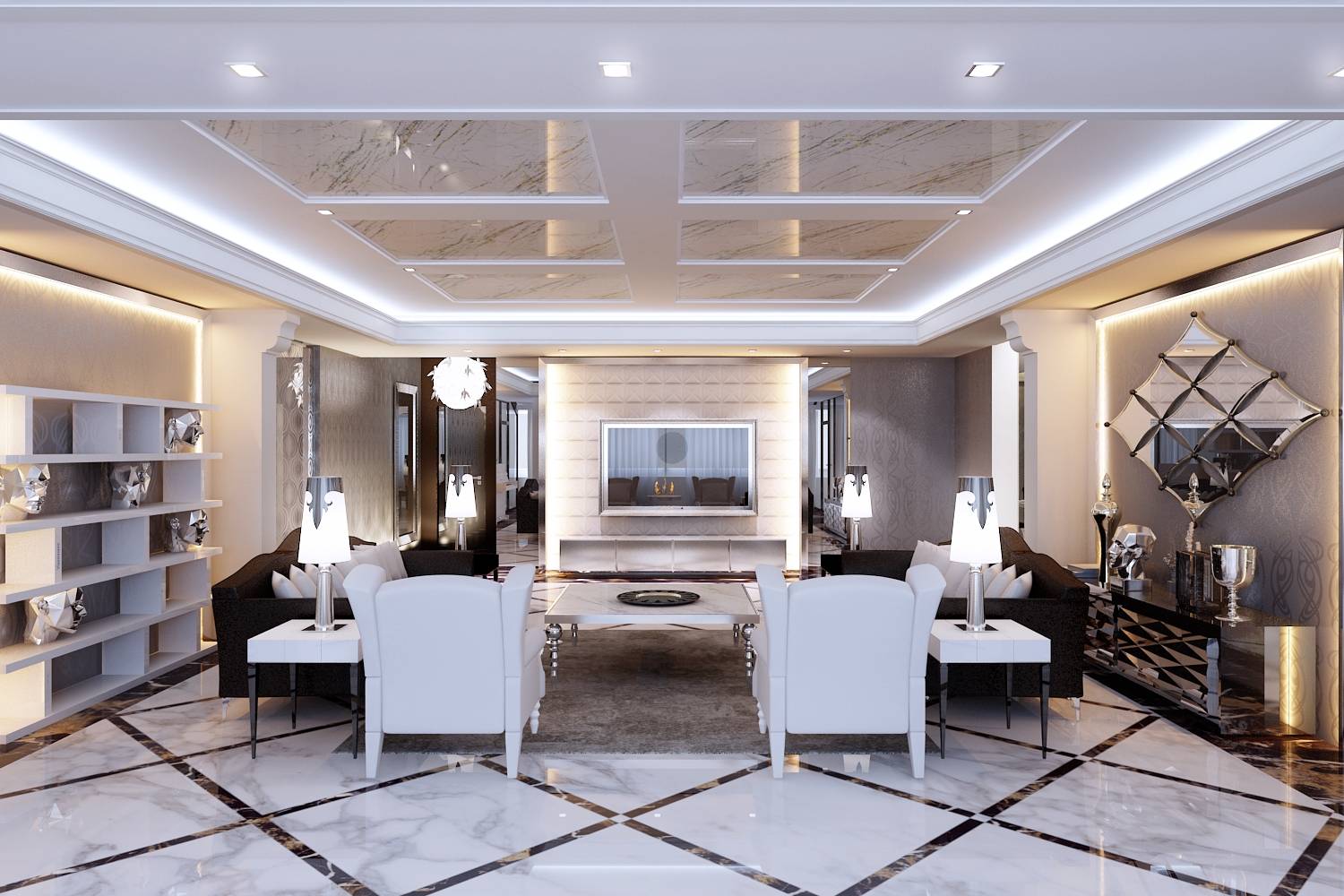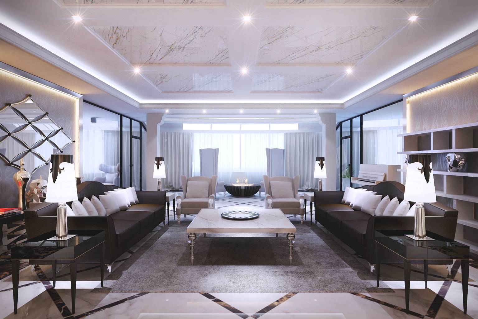- напольное покрытие под мрамор в гостиной;