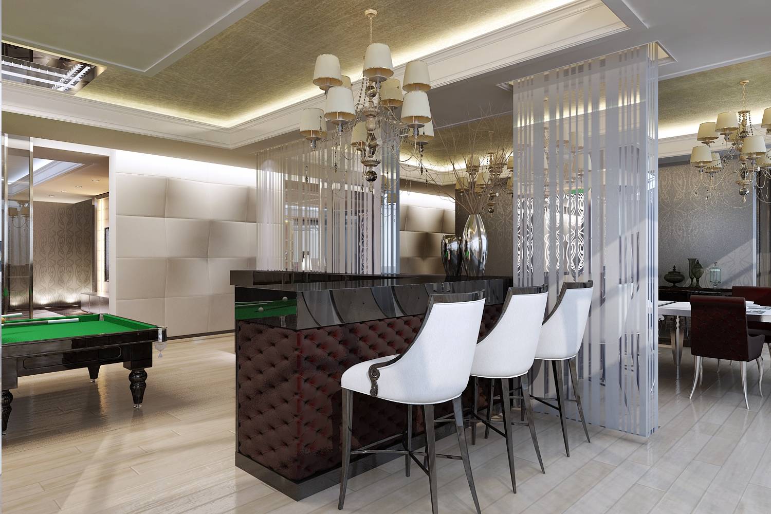 В бильярдной и столовой встроенная в карнизы подсветка помогает подчеркнуть сложное, с множеством ниш, оформление потолков. Барная стойка в бильярдной обшита стеганой тканью в стиле «Честерфилд». В этой же манере выполнены стулья в столовой, кресла в библиотеке, в зоне отдыха в спальне.
