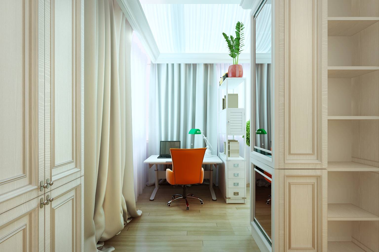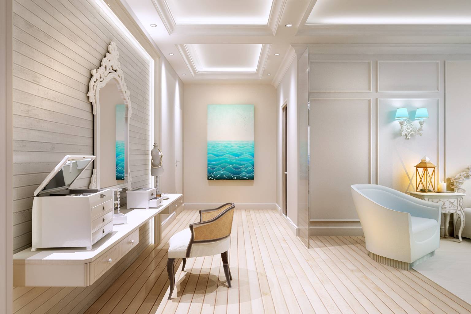 Интерьер спальной комнаты выполнен с легким намеком на морскую тематику – с палубной доской на полу и в отделке стены в зоне туалетного столика, струящимися, словно морские волны, шторами. Спальное место и зона ванной композиционно объединены и разграничиваются лишь перегородкой с декоративным камином.