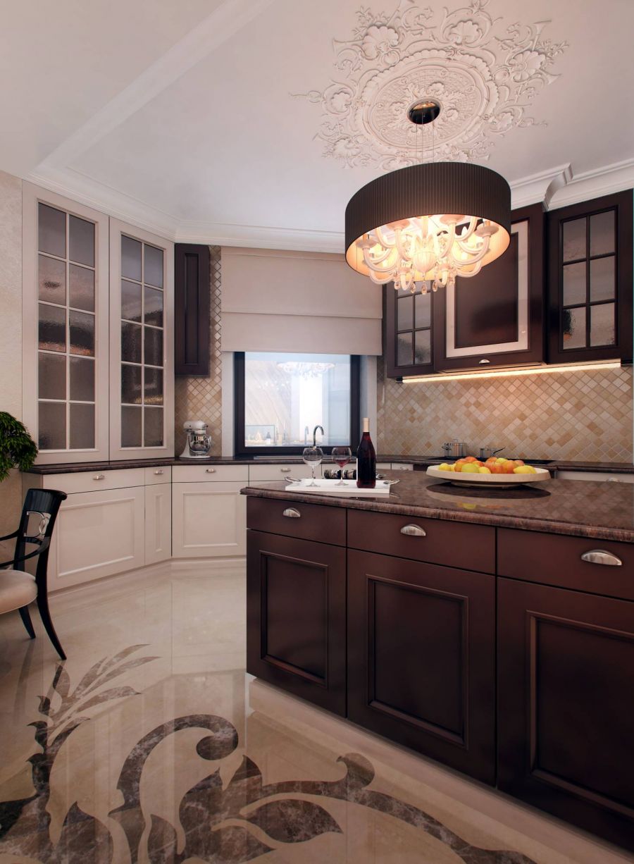 В целом дизайн квартиры в коричнево-бежевых тонах получился умиротворяющим, но с нотками шика – в виде хрустальных элементов ламп, рамы зеркала. А за счет выборочного включения каштановых красок в светлое окружение удалось сделать обстановку более рельефной, придать ей глубину.