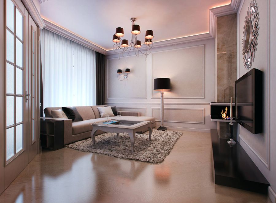 Планировка гостиной усложняется асимметрией комнаты. Именно поэтому в качестве базовой здесь лучше использовать бежевую гамму. Украшенные молдингами стены, подсвеченный потолок, угловой диван формируют единое светлое пространство, в котором выигрышно взаимодействуют кофейные оттенки – шторы, светильники, подиум для декоративного камина.