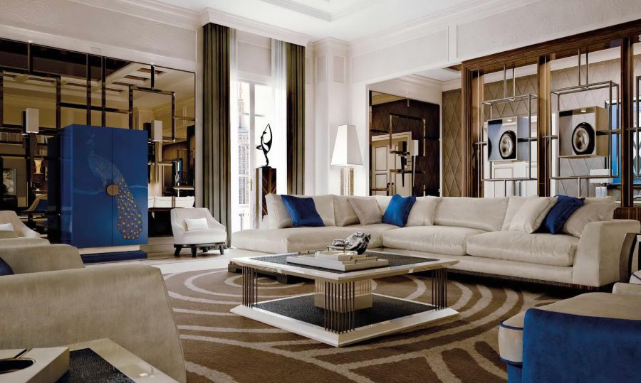 А вот интересное решение в роскошном стиле арт-деко, где помимо белого вводится акцентный синий.