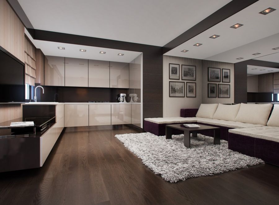 Интерьер гостиной в коричнево-бежевых тонах всегда выгодно сочетается с белыми потолками, даже в невысоких помещениях. Главный способ ввести темную основу – напольное покрытие насыщенных древесных оттенков: паркет, доска, ламинат. Если на совмещенной с гостиной кухне уложить плитку с рисунком под дерево, можно подчеркнуть стилевое единство планировки.